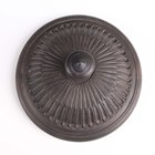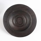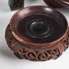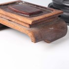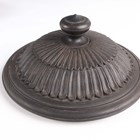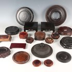 A Chinese hardwood lid or cover, Qing dynasty, possibly zitan wood, of domed circular form with finely carved radiating petal decoration, beneath a turned knop finial, diameter 14.4cm, together with a collection of nineteen wood stands, some with carved and pierced aprons, including two square stands, width 11.2cm.