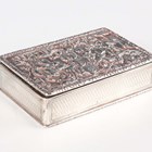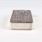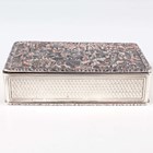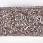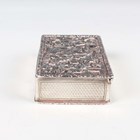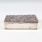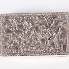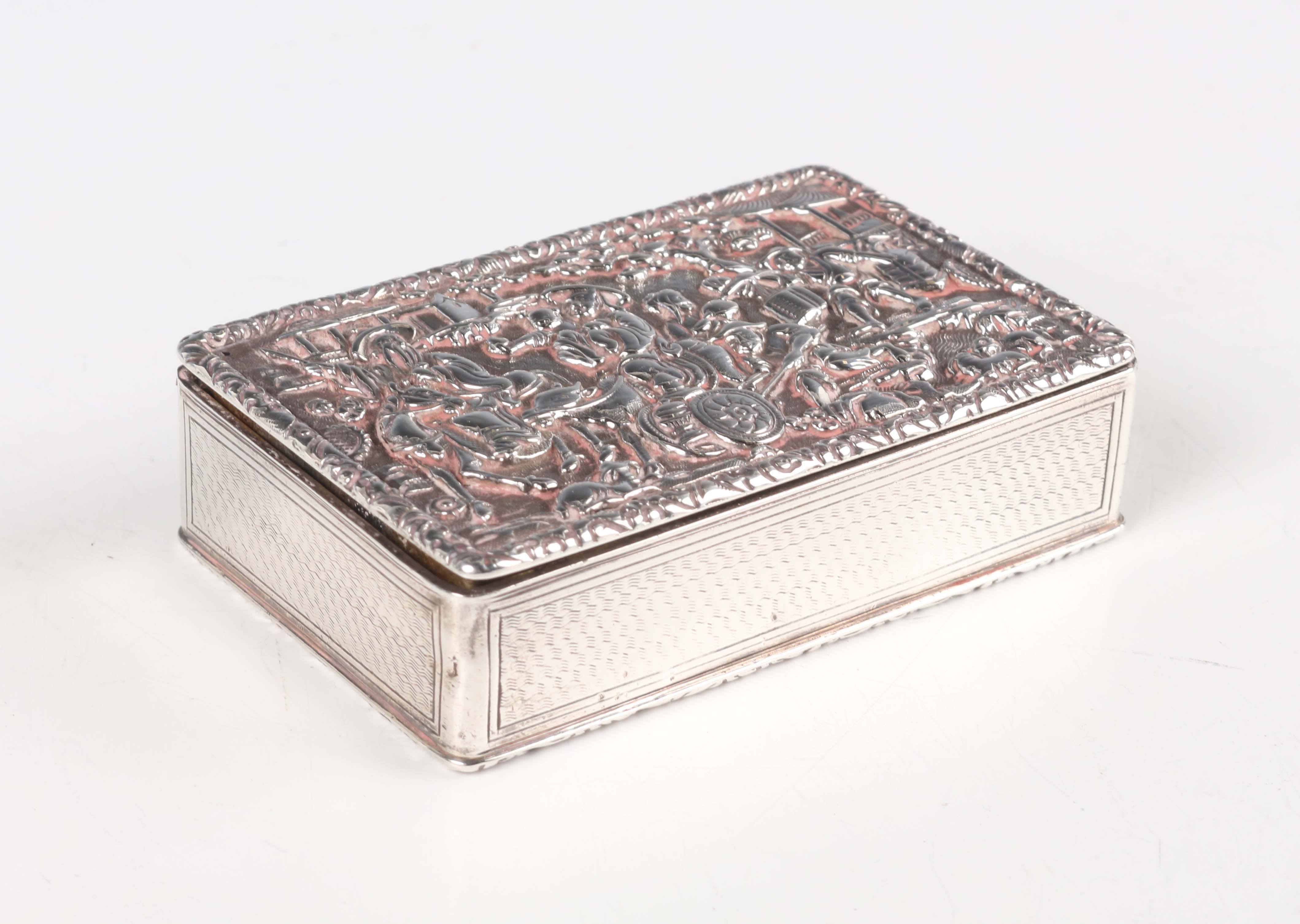 A Chinese export silver rectangular snuff box, early 19th century, the hinged lid and base panel decorated in relief with figural scenes within cast foliate borders, engine turning to sides, pseudo 'P' letter mark to rim of lid, weight 115g, length 7.4cm.