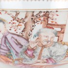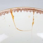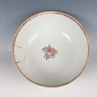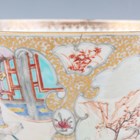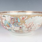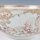 A Chinese famille rose export porcelain punch bowl, Qianlong period, the exterior painted and gilt with figural scenes divided by landscape vignettes, height 10.9cm, diameter 25.8cm (cracked and repaired).