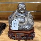 A Chinese export silver figure of a seated Buddha, early 20th century, modelled wearing an open robe, indistinct maker's mark to base, weight 241.9g, height 11.7cm, together with a carved hardwood stand.