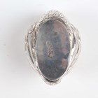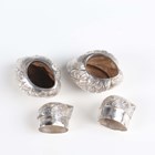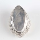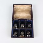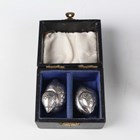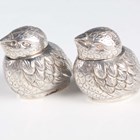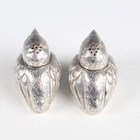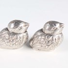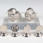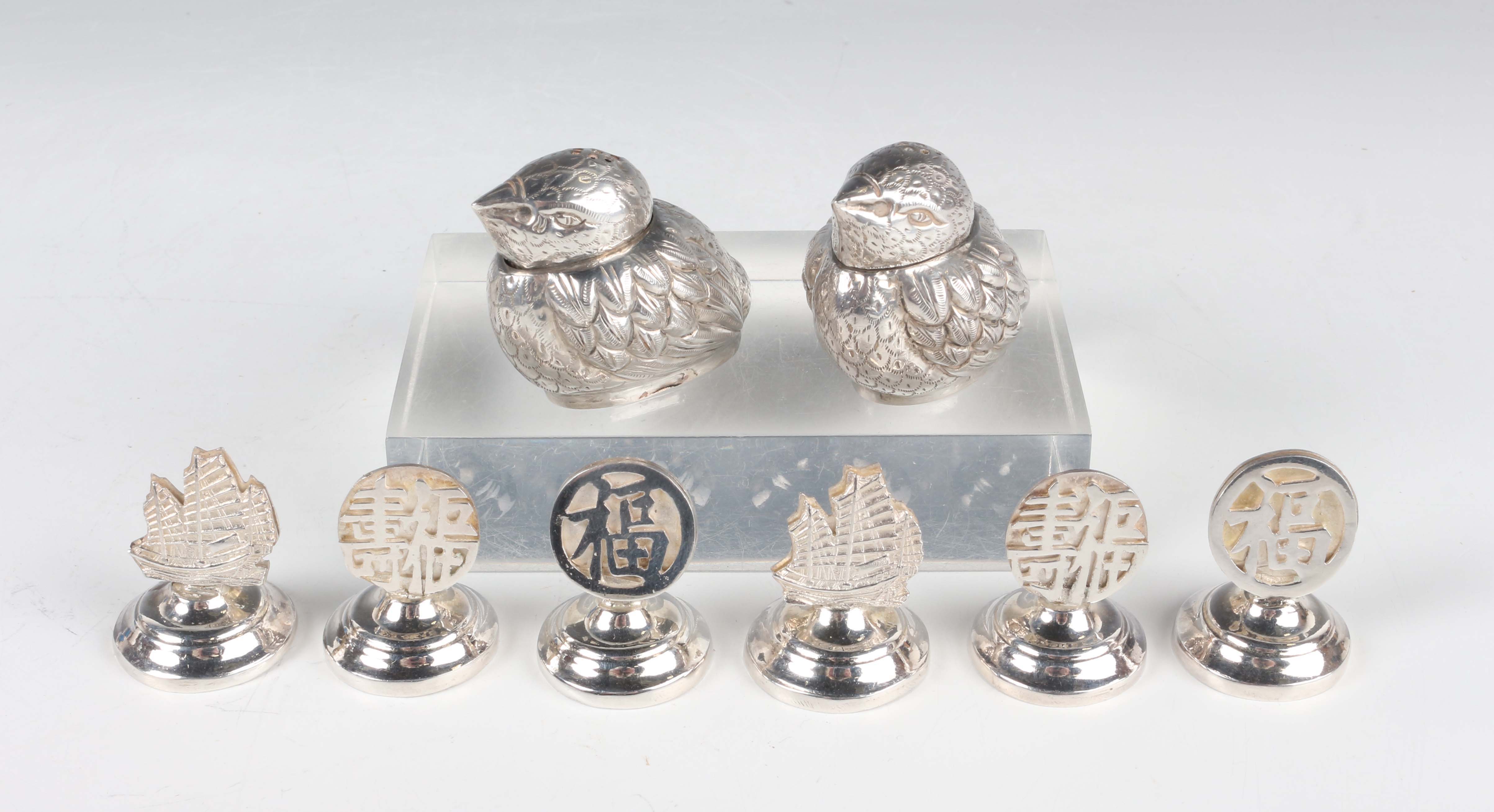 A pair of Chinese export silver chick peppers with removable covers and engraved plumage, weight 25.5g, height 3.8cm, with silk lined box, together with six silver place settings, comprising four decorated with characters and two with junk boats, all on circular bases, detailed 'Sterling F.J 925', total weight 75.1g, with silk lined box.