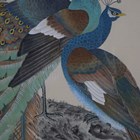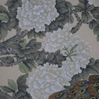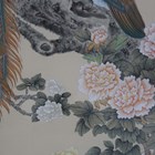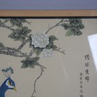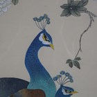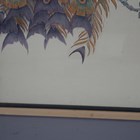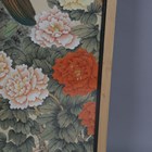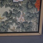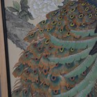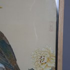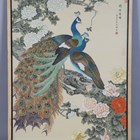 A Chinese watercolour painting on silk, 20th century, depicting a pair of peacocks perched on a blossoming branch, two lines of black text and two red seals to upper right corner, 104cm x 70cm, framed and glazed.