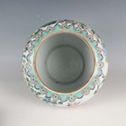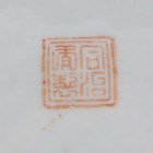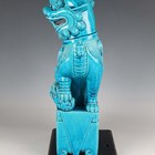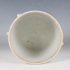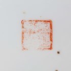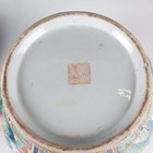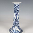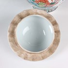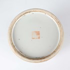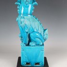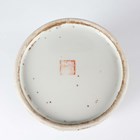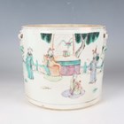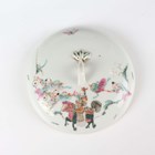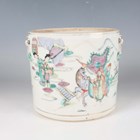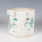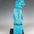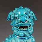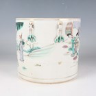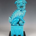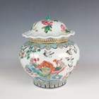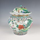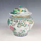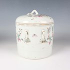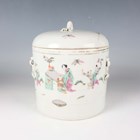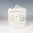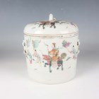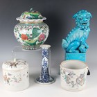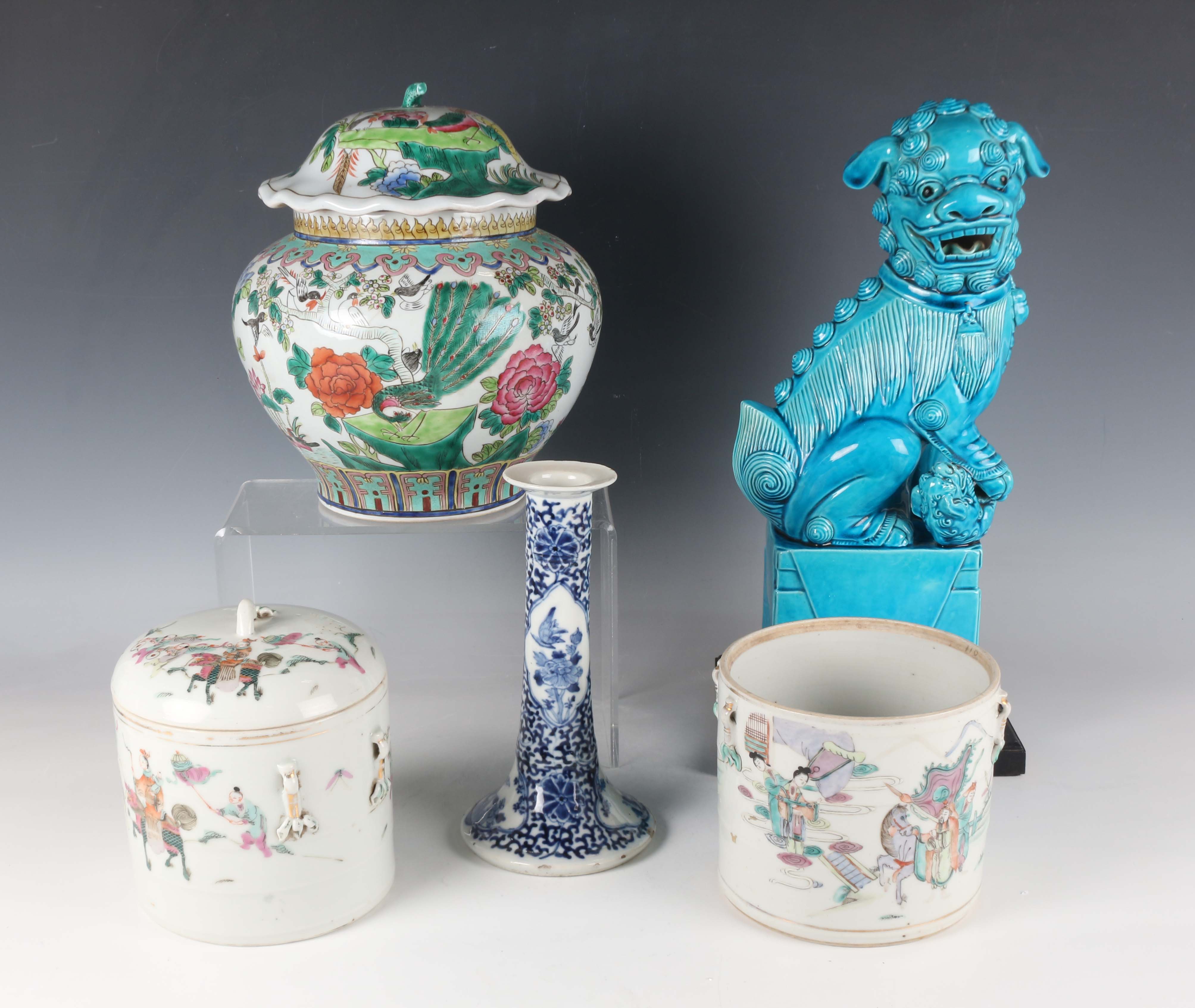 Two Chinese famille rose porcelain food jars and a cover, early 20th century, each of cylindrical form, painted and gilt with figural scenes beneath moulded handles, iron red seal mark to bases, heights 15.4cm and 12.2cm, together with a Chinese famille rose jar and cover, height 22.5cm, a Chinese turquoise glazed Buddhistic lion on a cube base, height 35cm, and a Chinese blue and white porcelain candlestick, height 20.2cm (minor faults).