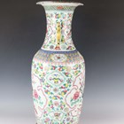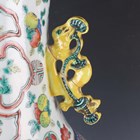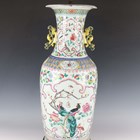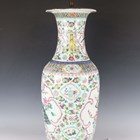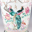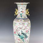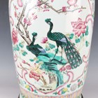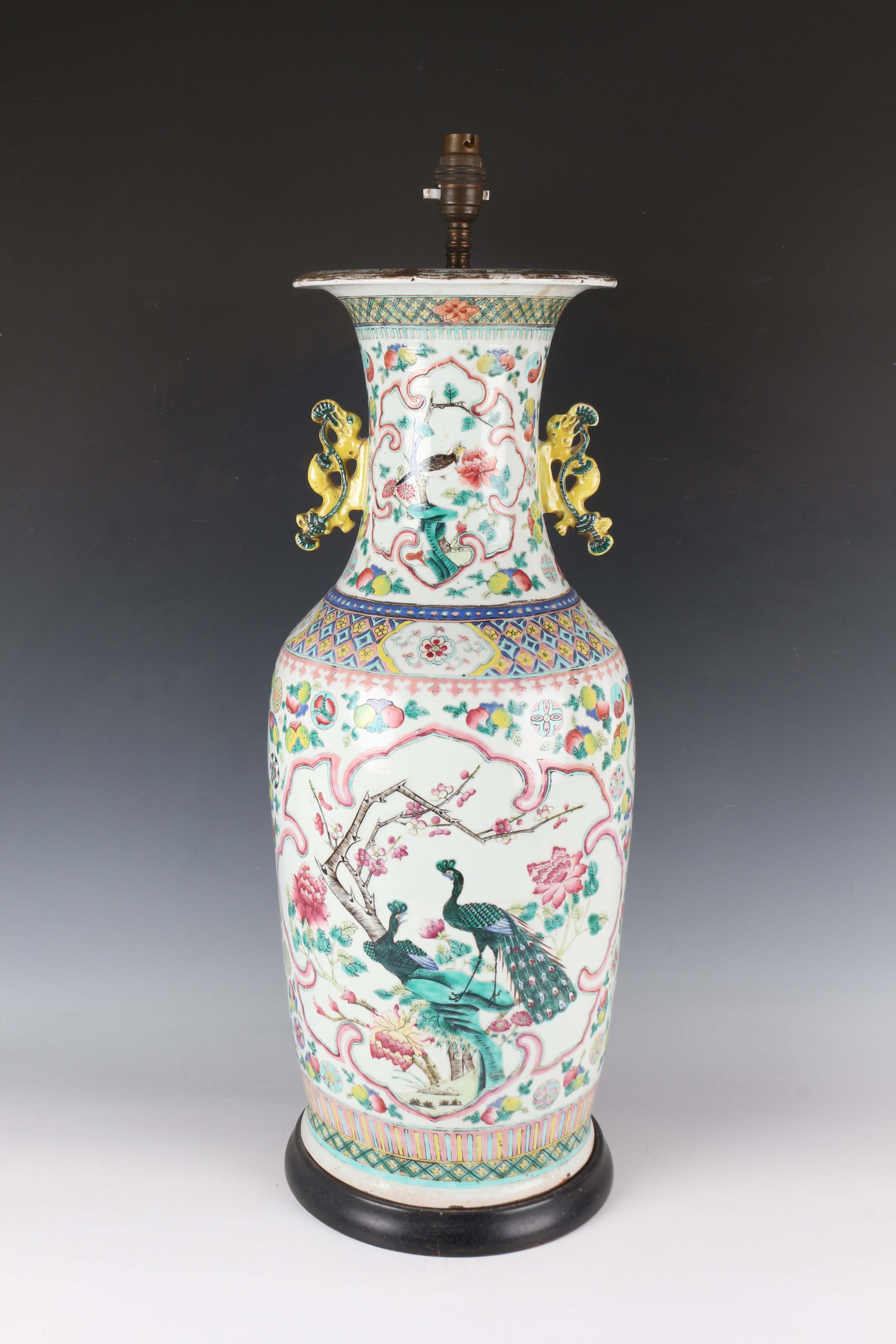A Chinese famille rose porcelain vase, late 19th century, the shouldered tapering body painted with opposing panels of ornamental pheasants and peacocks amidst blossoming branches, the flared narrow neck similarly decorated and flanked by a pair of yellow and green handles, height 59.5cm (drilled to base and converted to a table lamp, one handle repaired).