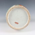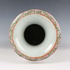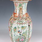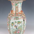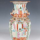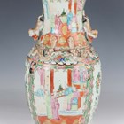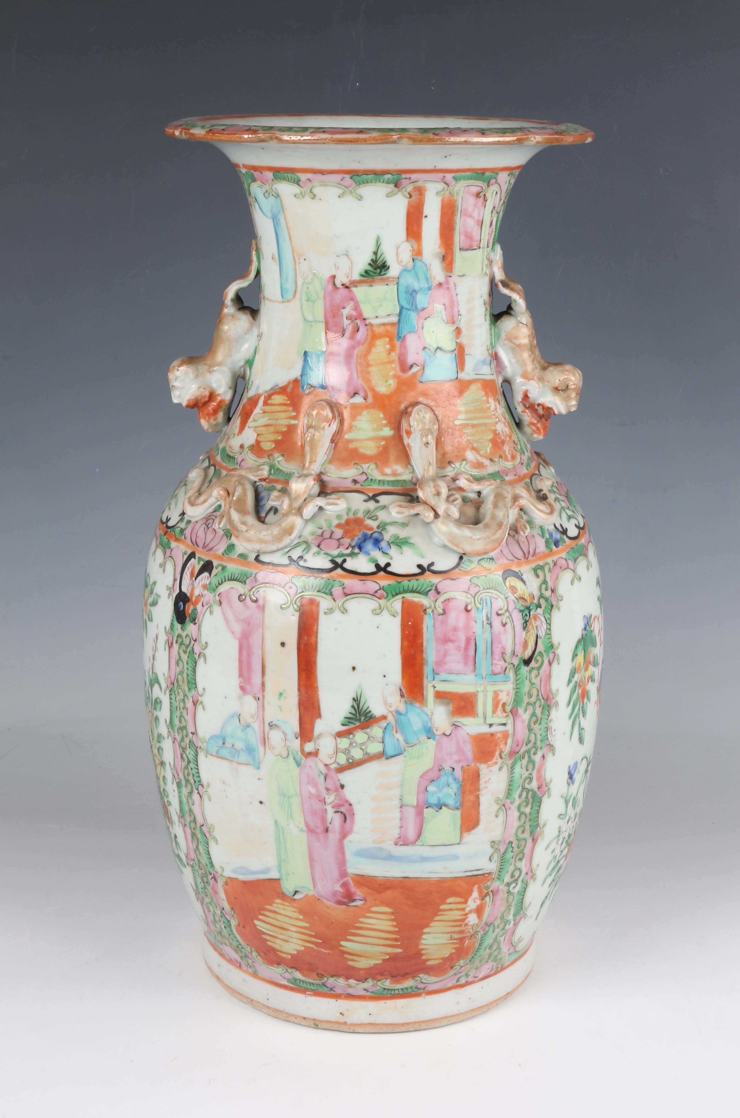 A Chinese Canton famille rose porcelain vase, late 19th century, of shouldered tapering form with flared neck, applied gilt chilong to shoulders and Buddhistic lion handles, typically painted with panels of figures, birds and flowers, iron red printed 'China' to base, height 34cm.