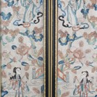 A pair of Chinese silk embroidered rectangular sleeve panels, late Qing dynasty, each worked in coloured and gilt thread with figures, flowers, trees and fences on a cream ground, 45cm x 8cm, framed and glazed.