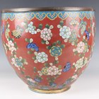A Chinese cloisonné jardinière, early 19th century, of 'U' shaped form, decorated with polychrome butterflies and flowers on a keyfret-filled iron red ground, height 30.8cm (minor faults).