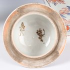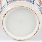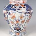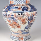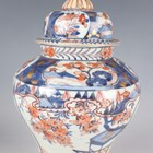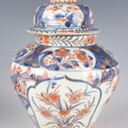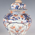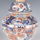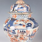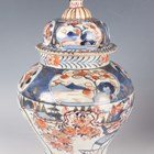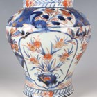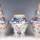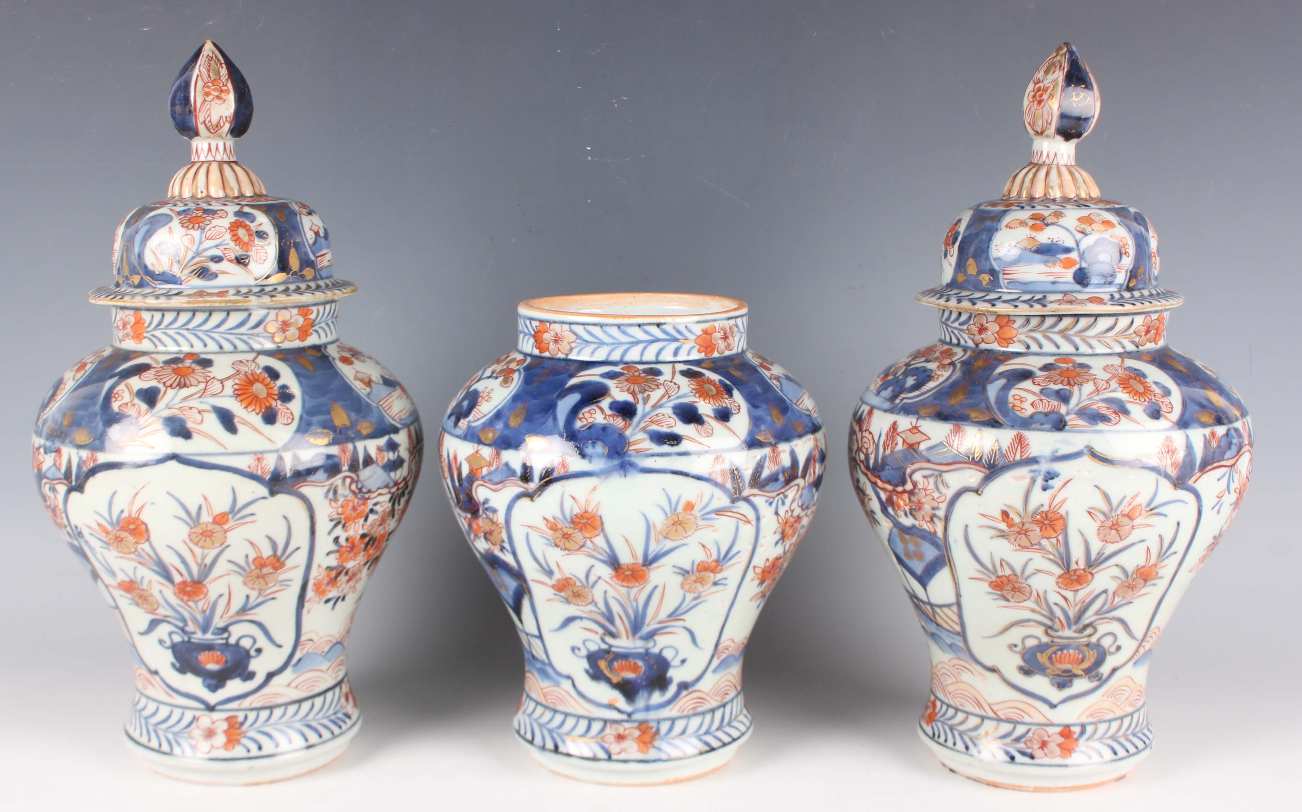 A garniture of three Japanese Imari porcelain vases and two covers, early 18th century, each baluster body painted and gilt with opposing flower panels reserved against landscape grounds, heights 30cm and 19.5cm.