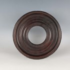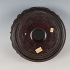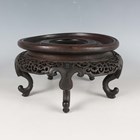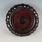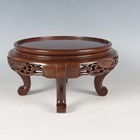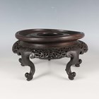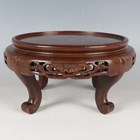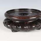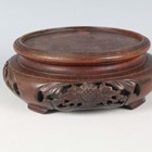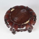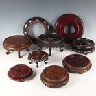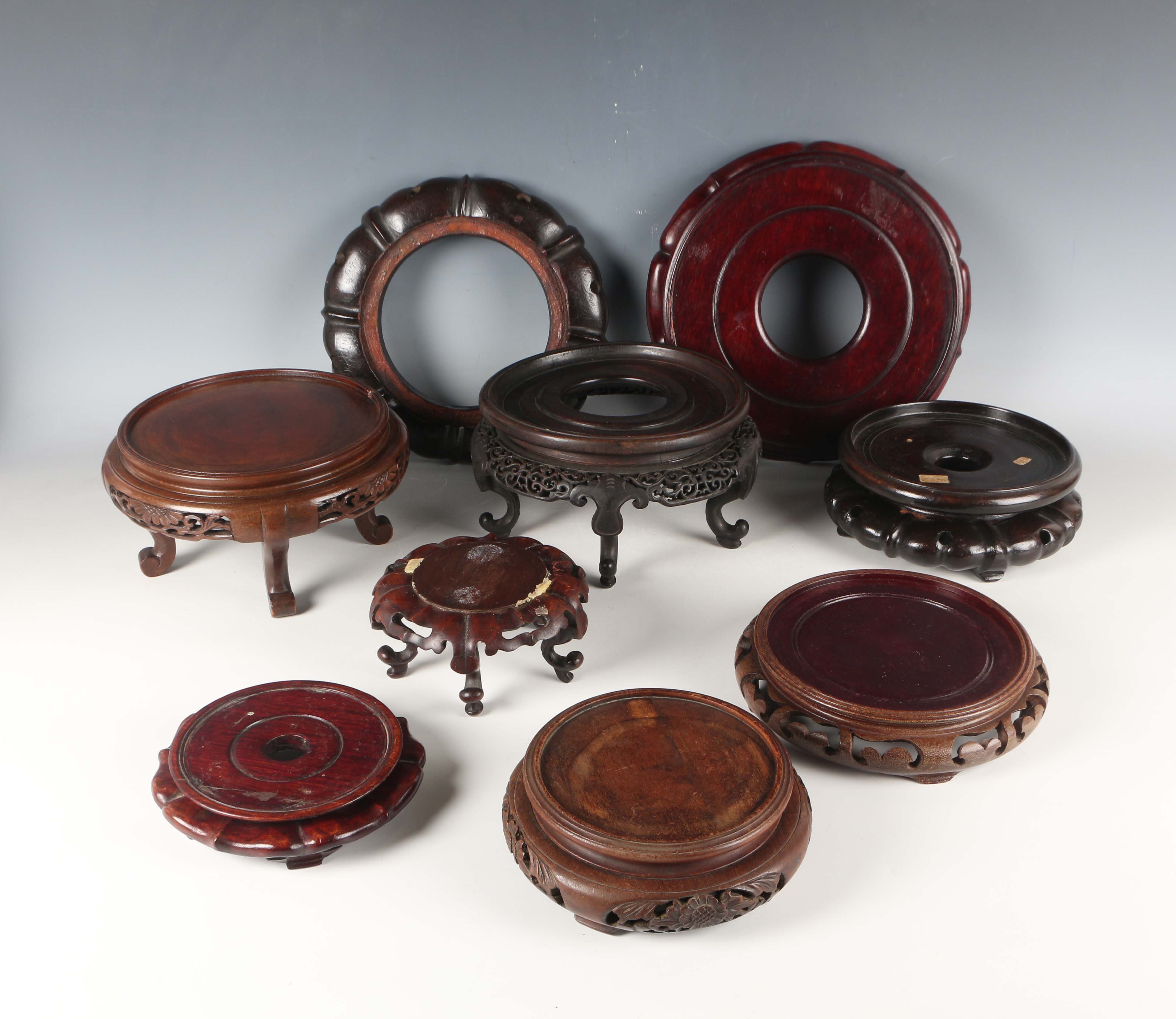 A collection of nine Chinese wood circular stands, mostly 20th century, including one with carved and pierced apron, on scroll legs, diameters ranging from 12.2cm to 23.2cm (one missing centre panel).