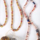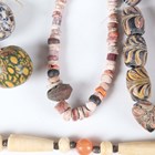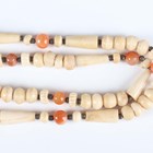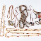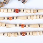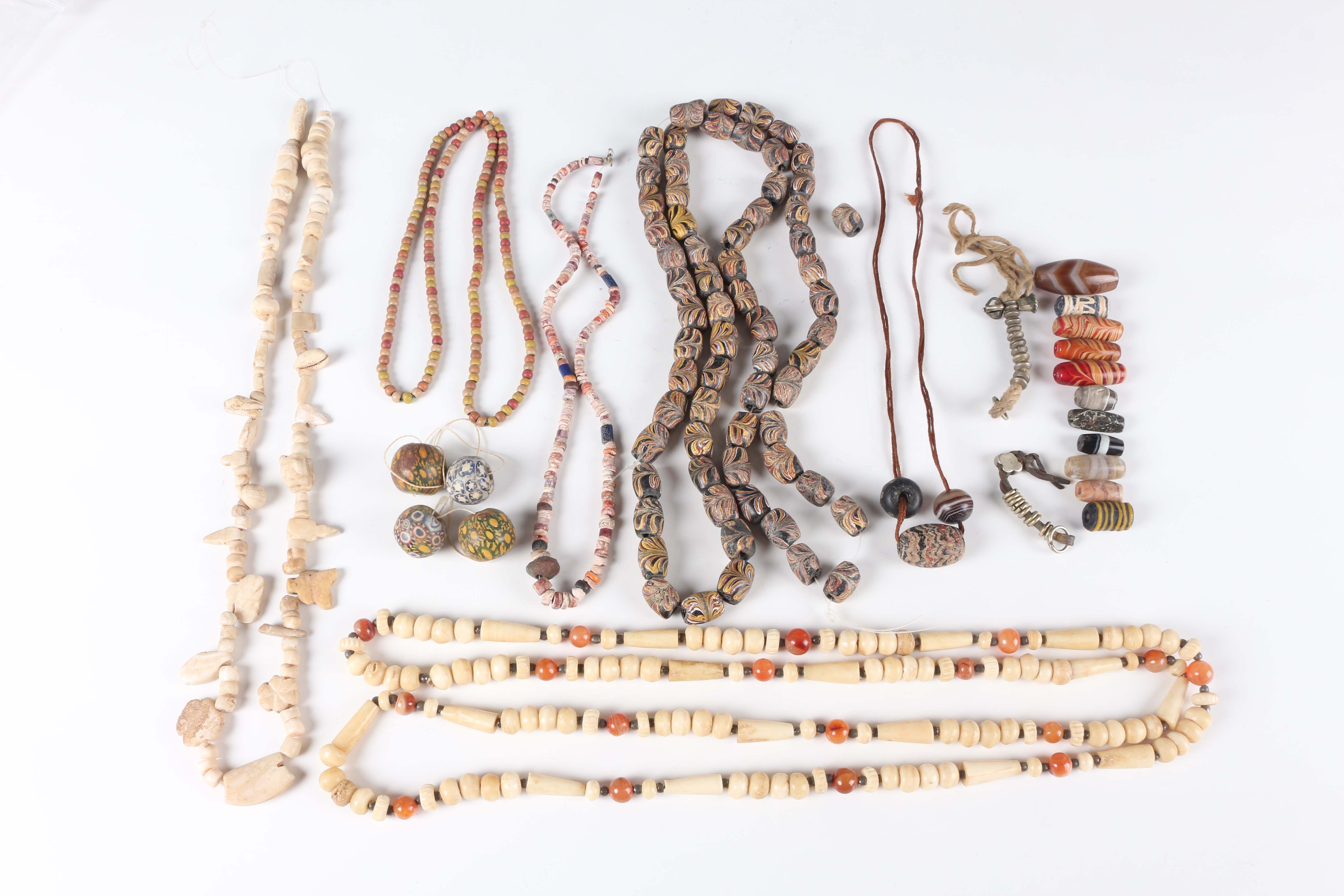 A Tibetan bone bead single row necklace with chalcedony bead spacers, the bone beads of circular, carved and conical form, length approx 120cm, together with a collection of other Tibetan and Asian beads and necklaces, including agate, glass and stone examples.