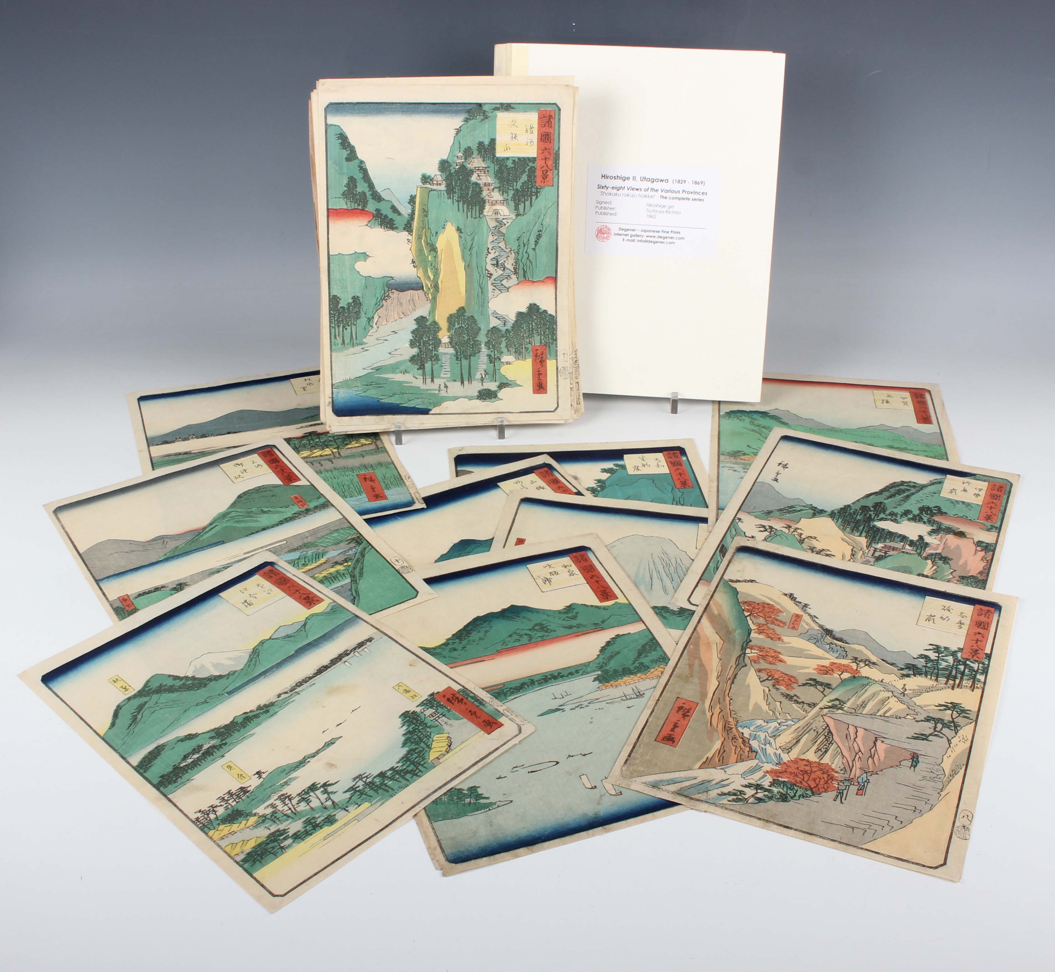 Hiroshige II (1826-1869) - a complete set of sixty-eight Japanese woodblock chuban prints, circa 1862, depicting the sixty-eight views of the various provinces (Shokoku Rokuju Hakkei), 24.5cm x 18cm, unframed.
