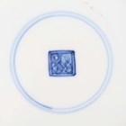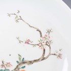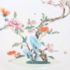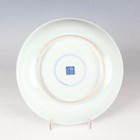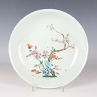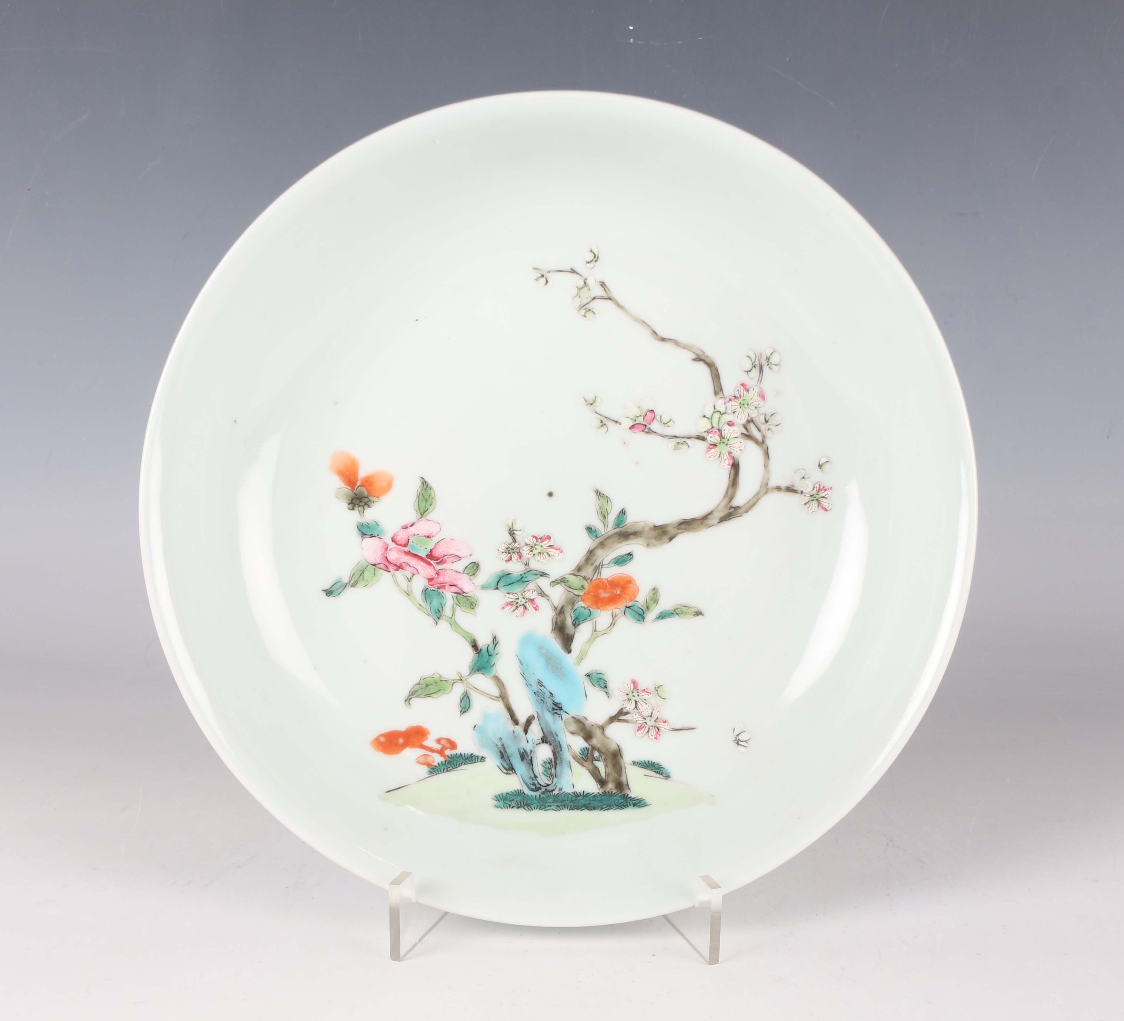 A Chinese famille rose porcelain saucer dish, Qianlong period, the interior painted with a blossoming prunus emanating from rocks with peony and lingzhi fungus, underglaze blue seal mark within double ring to base, diameter 20.2cm.