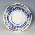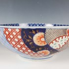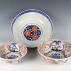 A Japanese Imari porcelain punch bowl, Meiji period, painted with panels of flowers and simulated brocade, height 12.4cm, diameter 30.5cm, together with a graduated pair of Japanese Imari porcelain bowls, painted with ho-o birds, flowers and foliage, diameters 22cm and 19cm.