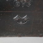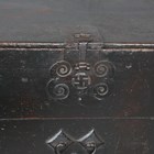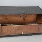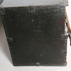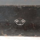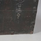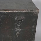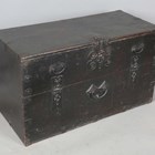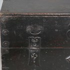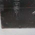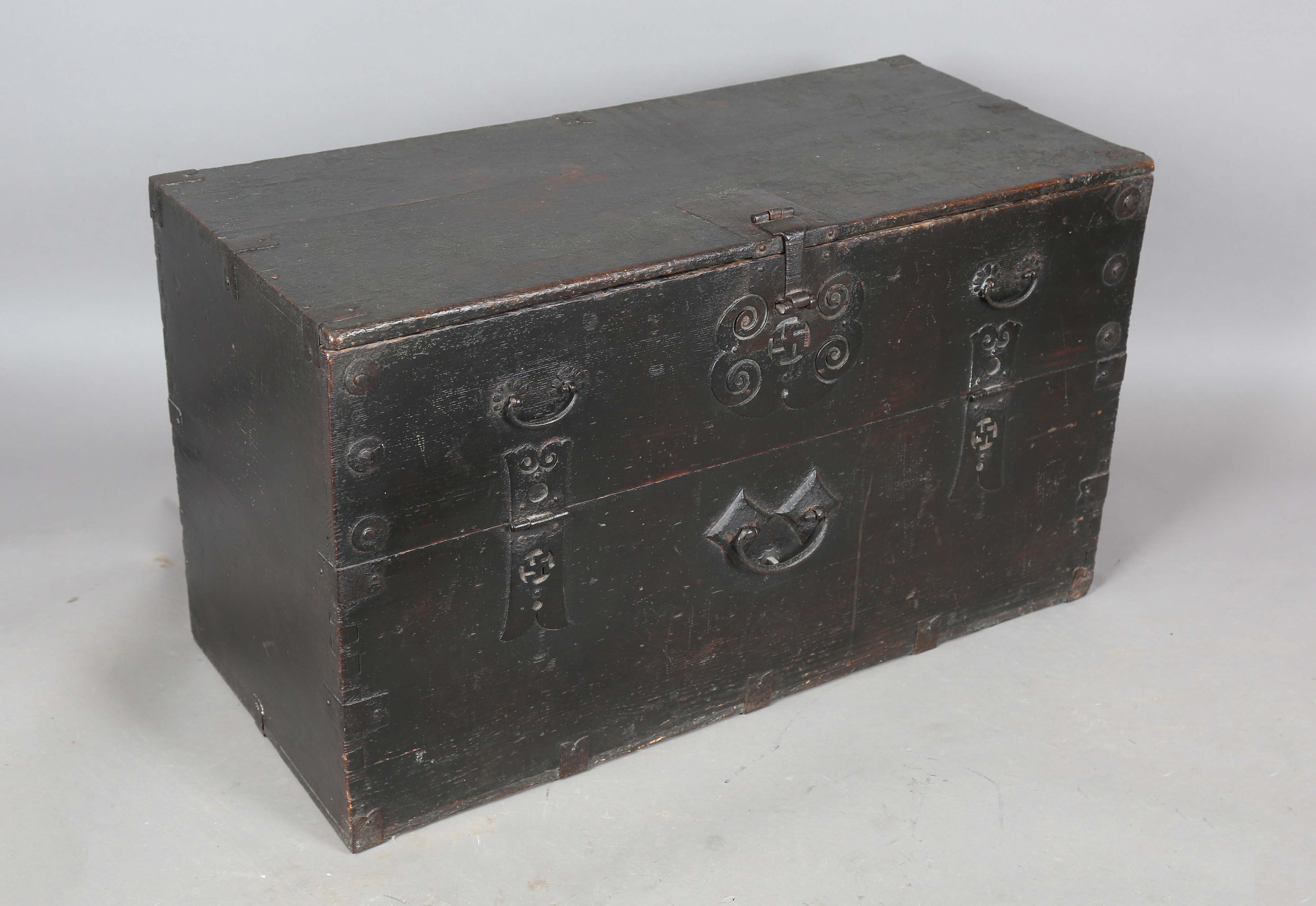 A Korean ebonized pine bandaji blanket chest, 19th century, with fall flap to front, fitted with wrought iron mounts, hinges, handles and locking plate, height 47cm, width 82.5cm, depth 38cm.