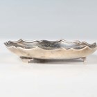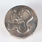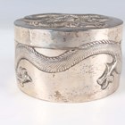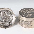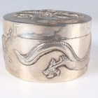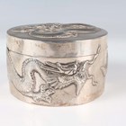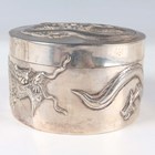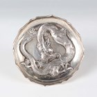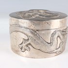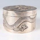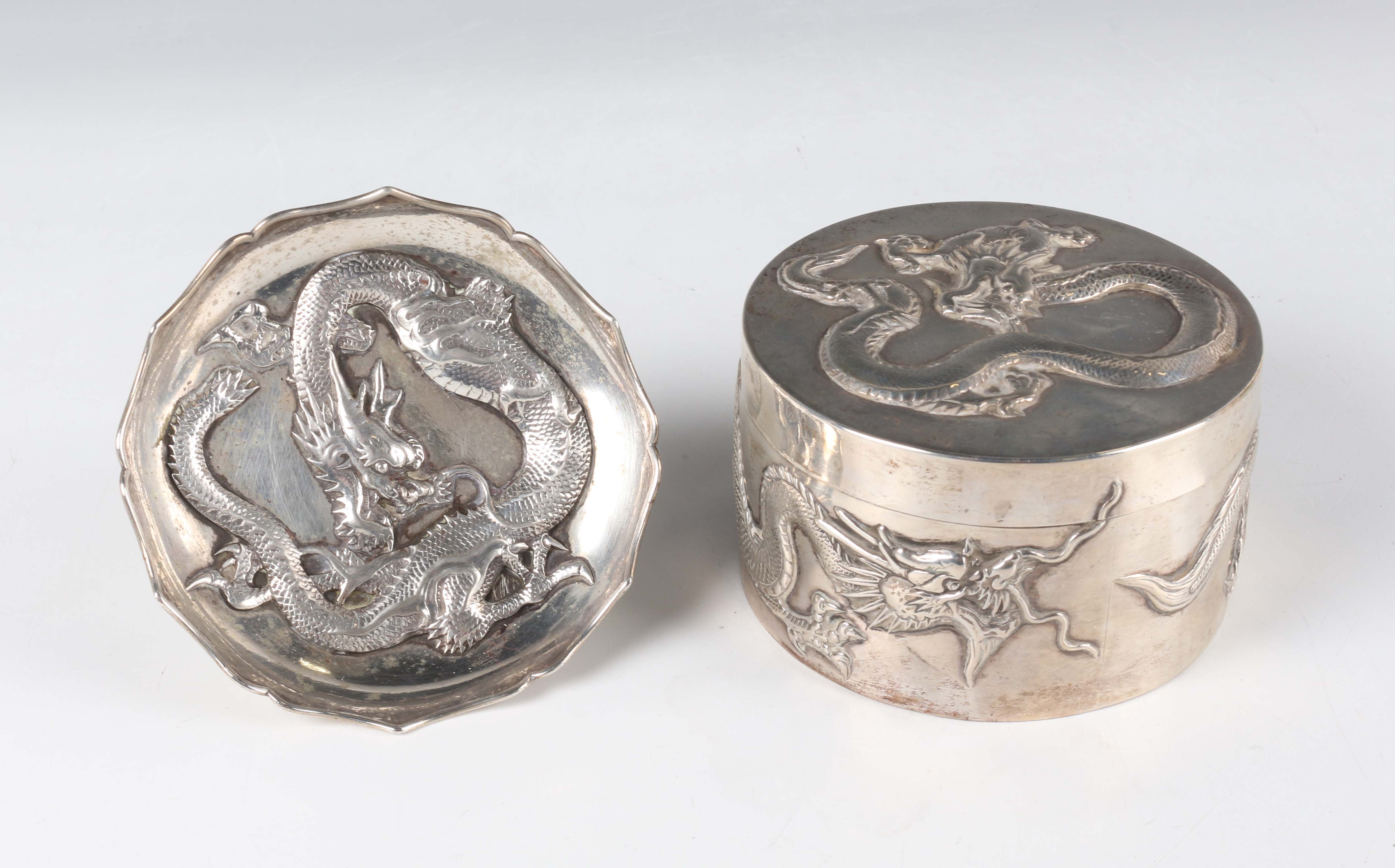 A Chinese export silver cylindrical box and cover by Wang Hing, late 19th/early 20th century, the top and sides decorated in relief with dragons, maker's mark to base, weight 170.7g, height 5.6cm, together with a similarly decorated circular dish by Hung Chong, weight 66.6g, diameter 9.4cm.