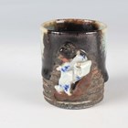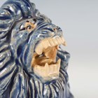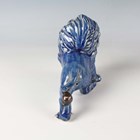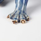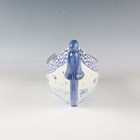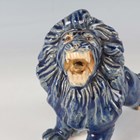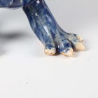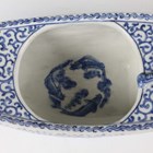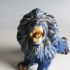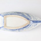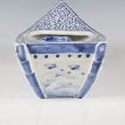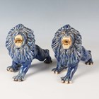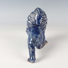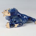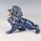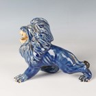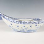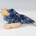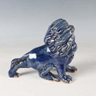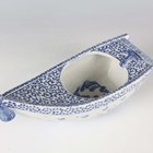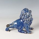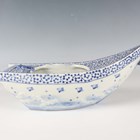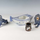 A Japanese Arita blue and white porcelain bowl, Meiji period, modelled as a boat, the sides painted with sparrows flying above relief moulded crashing waves, length 24cm, together with a Japanese Sumida ware porcelain pot, height 5.5cm, and a pair of Chinese blue glazed pottery figures of roaring lions, length 14cm.