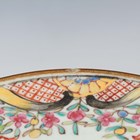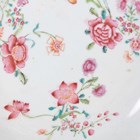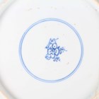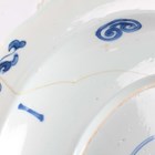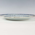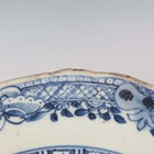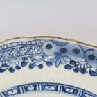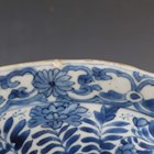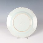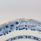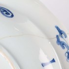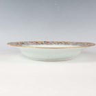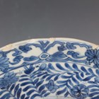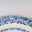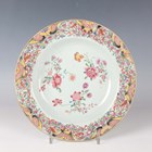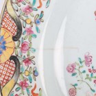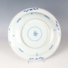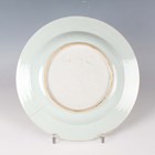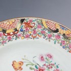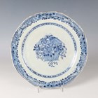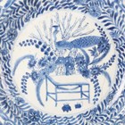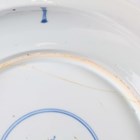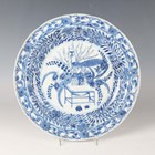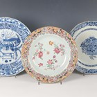 A Chinese blue and white porcelain circular dish, Kangxi period, painted with a peacock, table and flowers, diameter 25.4cm (repaired), together with a Chinese famille rose porcelain soup plate, Qianlong period, painted and gilt with flower sprays, diameter 23cm (hairline crack to rim), and a blue and white export porcelain plate, width 23cm (cracked).