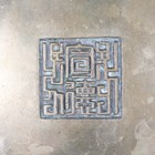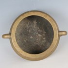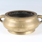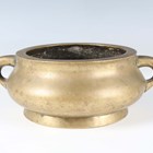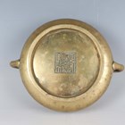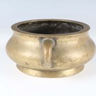 A Chinese bronze censer, mark of Xuande but probably 18th/19th century, the low-bellied circular body flanked by a pair of loop handles, cast stylized seal mark to base, weight 1092.4g, height 6.2cm, rim diameter 12cm, width across handles 17.5cm.