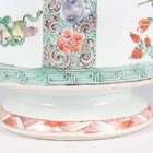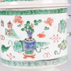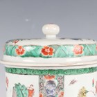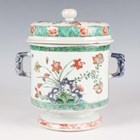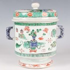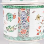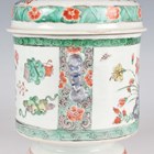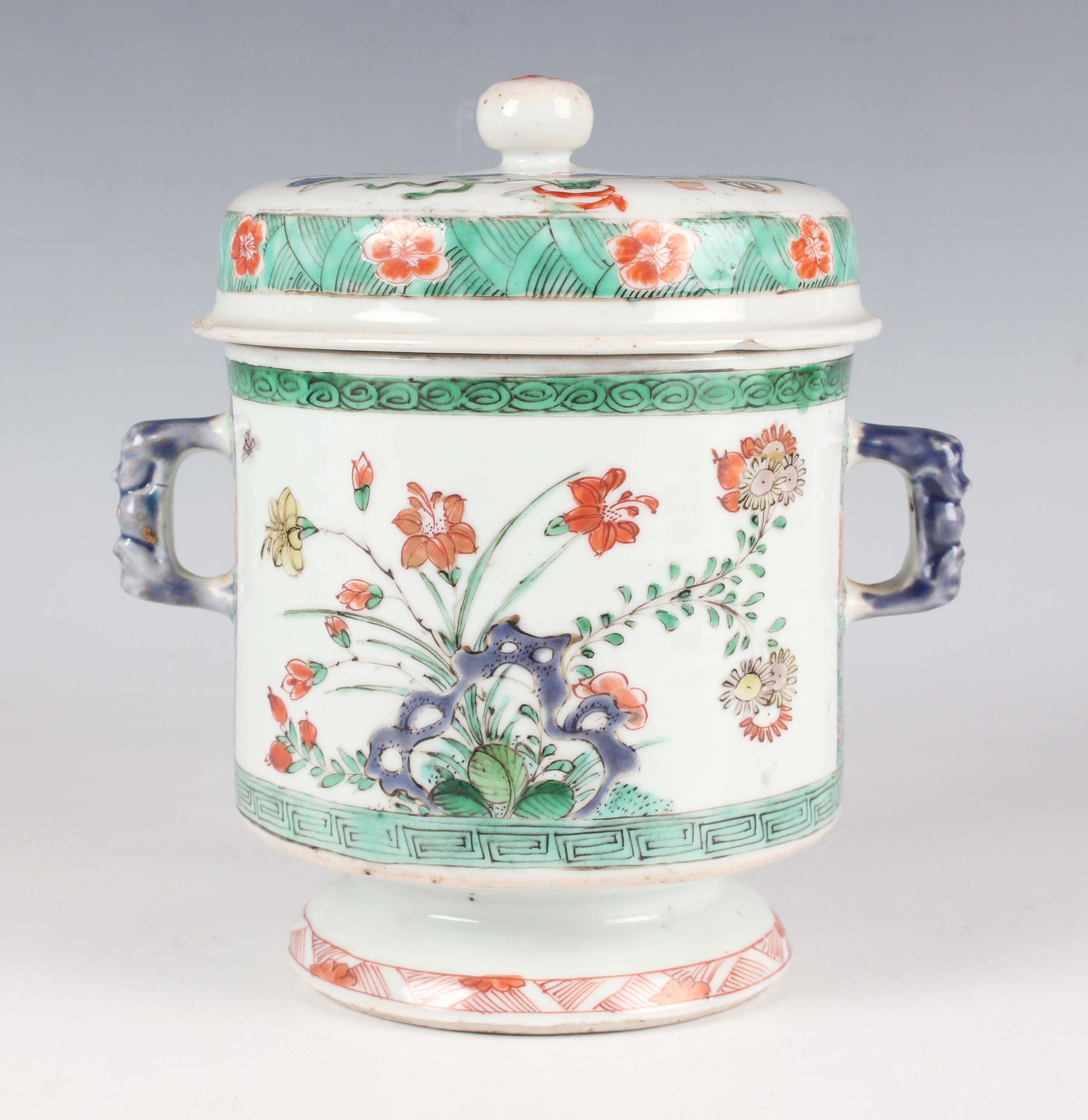 A Chinese famille verte export porcelain jar and cover, Kangxi period, the domed cover and cylindrical body painted and gilt with opposing precious objects and flowers, on a circular foot, height 15.6cm (minor rim chips to cover).