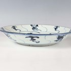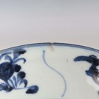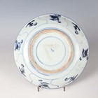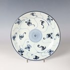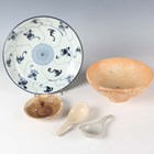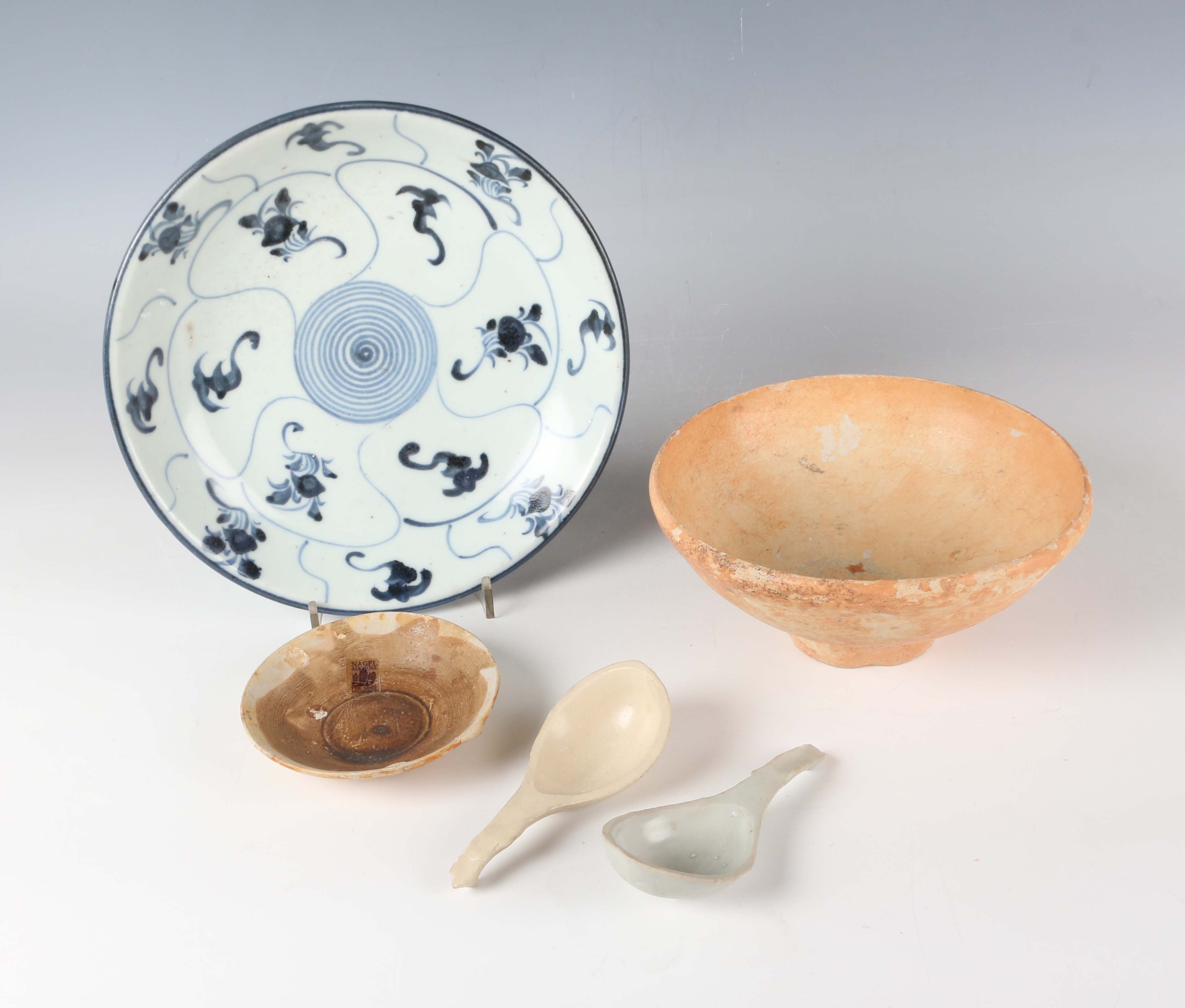 A Chinese Tek Sing Cargo blue and white porcelain Lotus pattern circular dish, circa 1820, diameter 19.3cm, together with four other shipwreck cargo pieces, comprising a small Tek Sing circular dish, bearing Nagel Auctions label, diameter 9cm, a similar larger bowl, diameter 15.5cm, and two spoons.