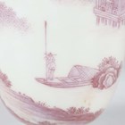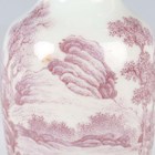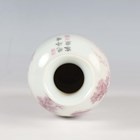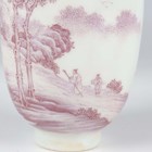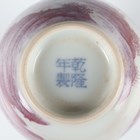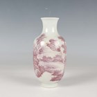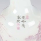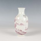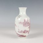 A Chinese puce decorated porcelain vase, mark of Qianlong but probably 20th century, the shouldered tapering body painted in puce with figures and pavilions in a coastal landscape, black painted five-character mark and three pink seals to shoulder, underglaze blue four-character mark to base, height 12.5cm.