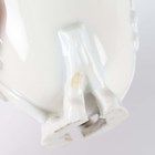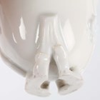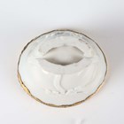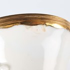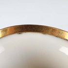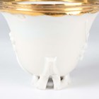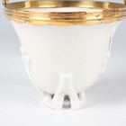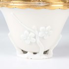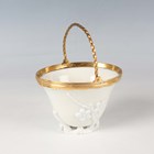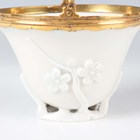 A Chinese blanc-de-Chine porcelain libation cup, Kangxi period, with later European gilt metal mounted rim and overhead twisted swing handle, the porcelain cup of traditional horn form, moulded with prunus branches forming the openwork foot, height including handle 10cm, length 8.7cm.