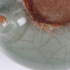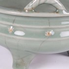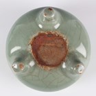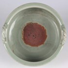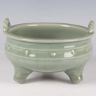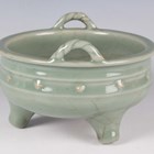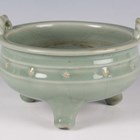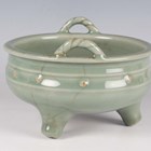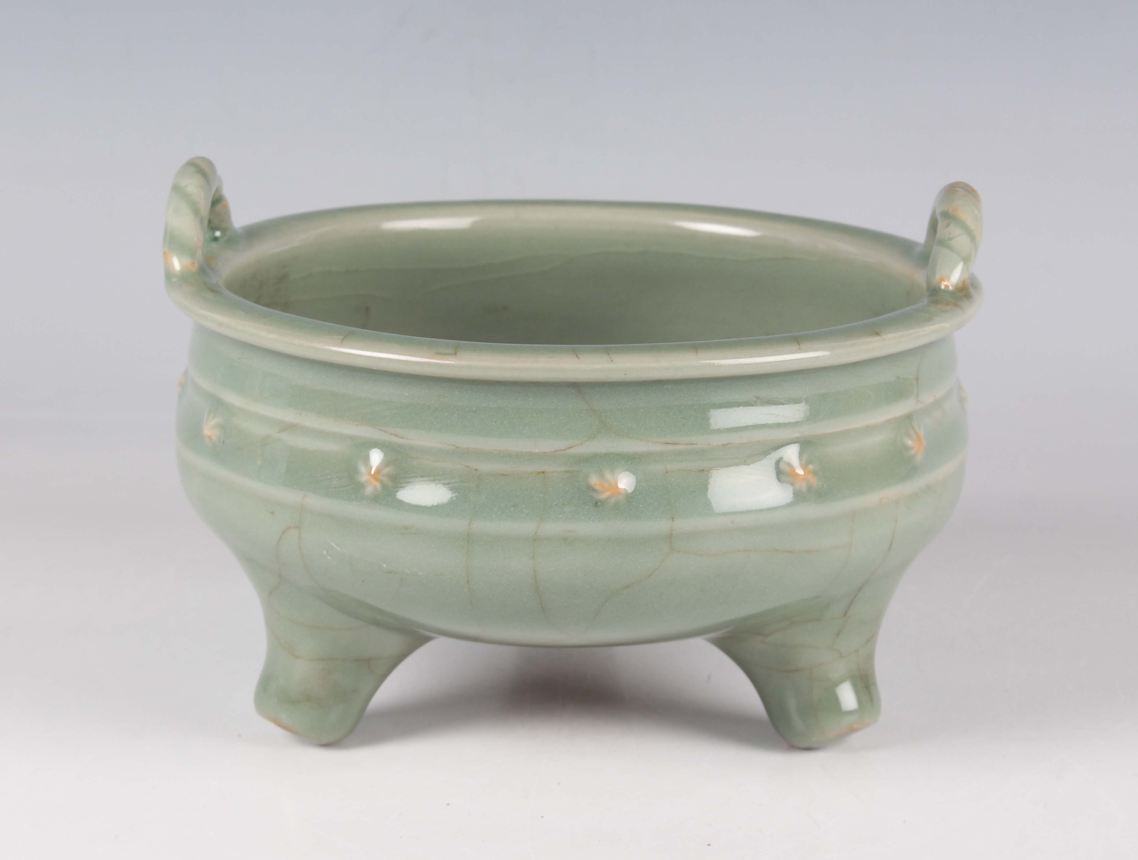 A Chinese Longquan celadon glazed tripod censer, Ming dynasty or later, of circular form with a pair of upright ropetwist handles to rim, above a band of relief stars, on three short feet, height 9.8cm, diameter 14.5cm.