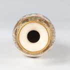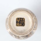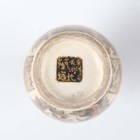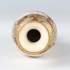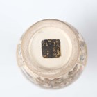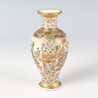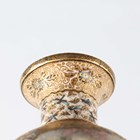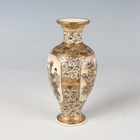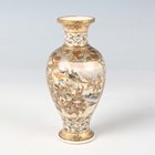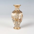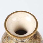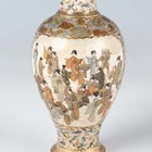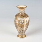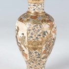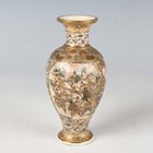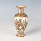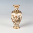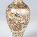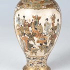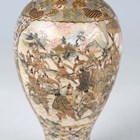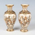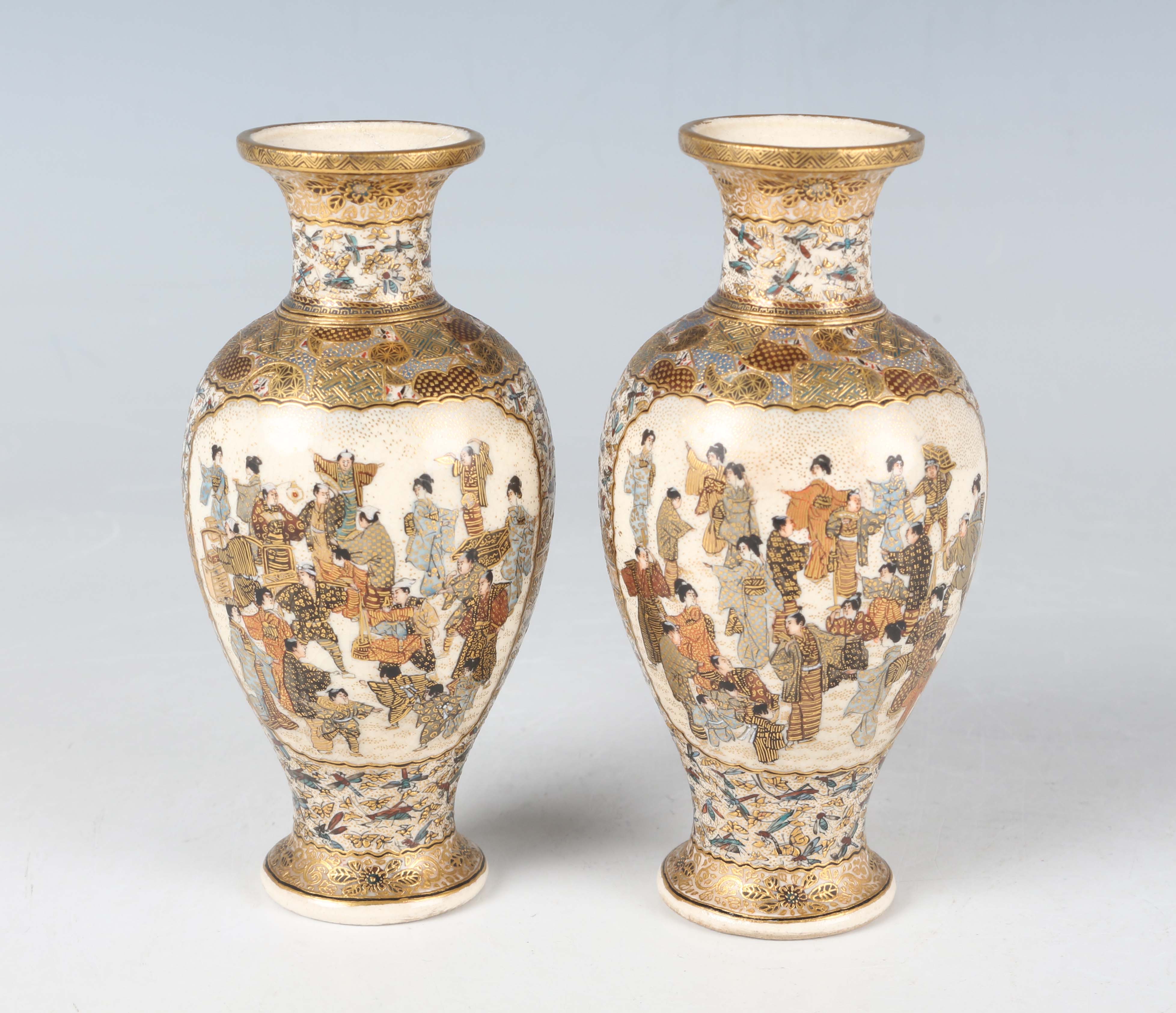A pair of Japanese Satsuma earthenware diminutive vases, Meiji period, each of baluster form with flared neck, painted and gilt with opposing figural panels, reserved against simulated brocade and insect filled grounds, gilt and black signature to bases, height 9.2cm (one with minor rim repair).