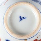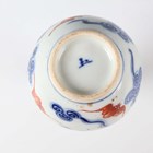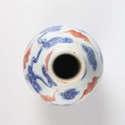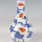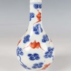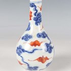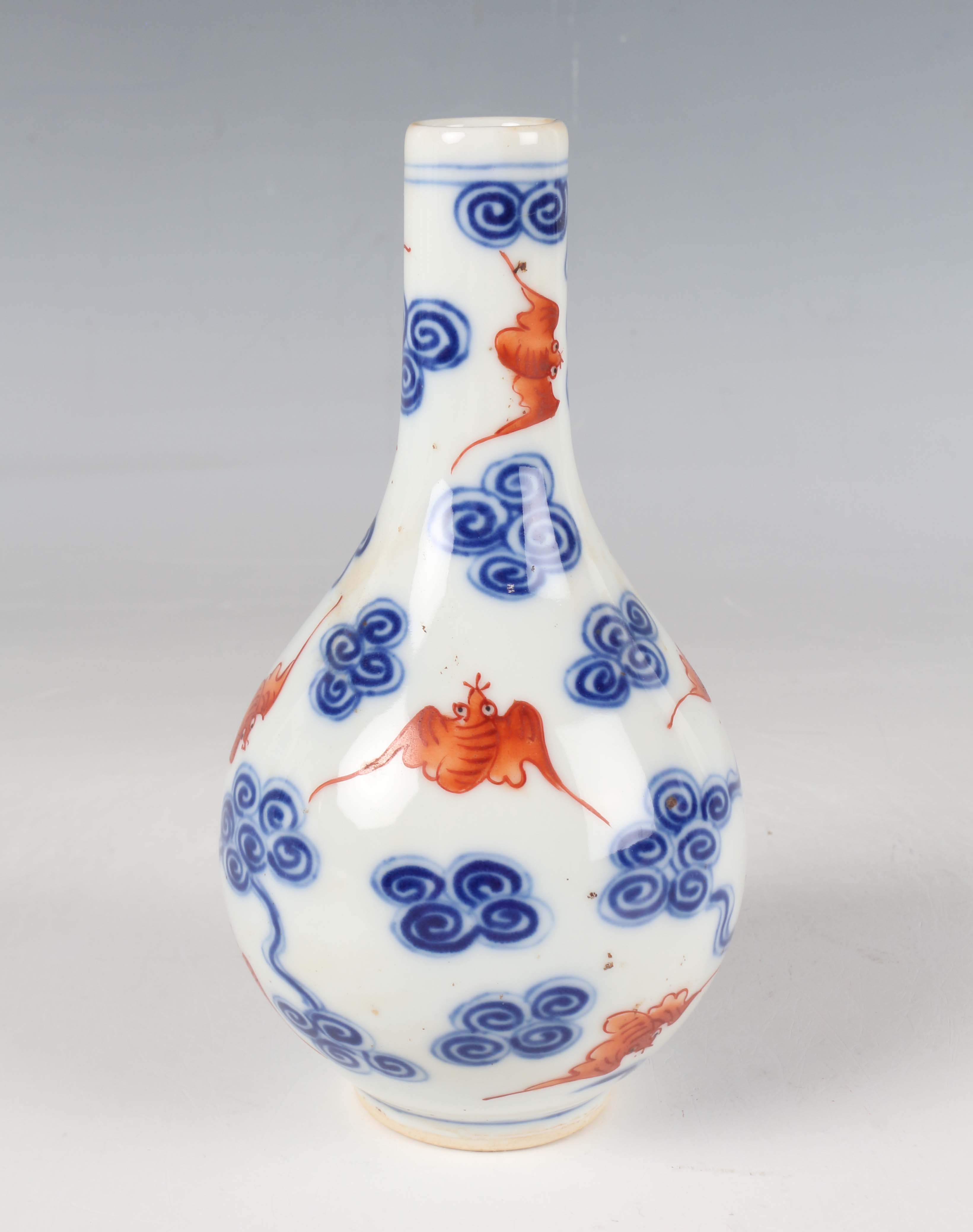 A Chinese iron red enamelled and underglaze blue decorated porcelain bottle vase, the ovoid body and narrow neck decorated with a design of bats flying amidst vapours, underglaze blue mark to base, height 13.8cm.
