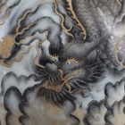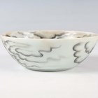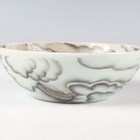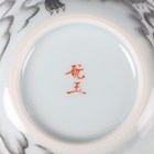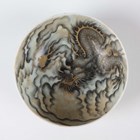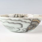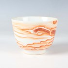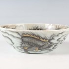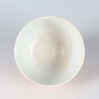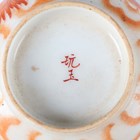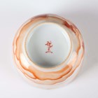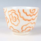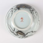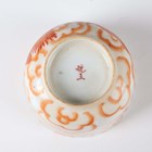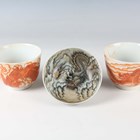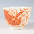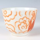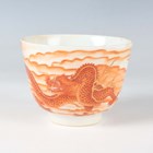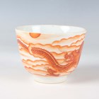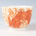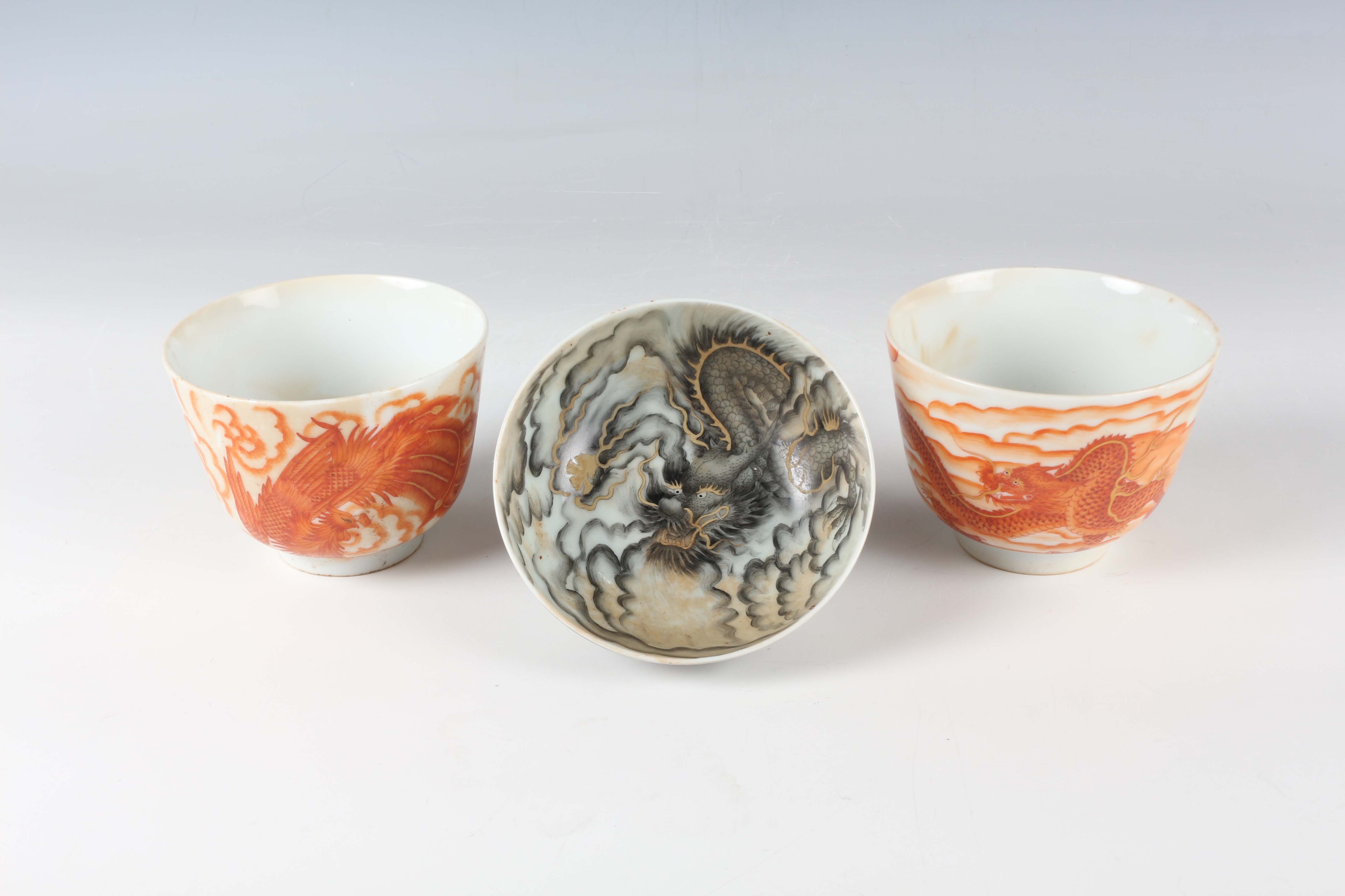 A pair of Chinese iron red decorated porcelain teabowls, probably 20th century or later, each of steep-sided 'U' form, one painted with a dragon amidst vapours, the other with a fenghuang, height 6.6cm, together with a similarly decorated small circular dish, painted en grisaille and gilt with a dragon and flaming pearl, diameter 9.6cm.