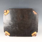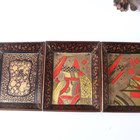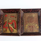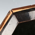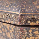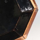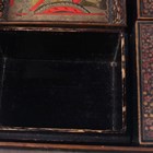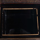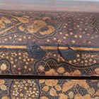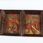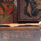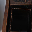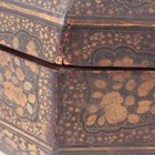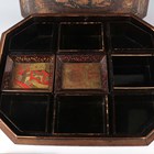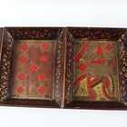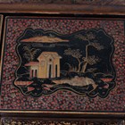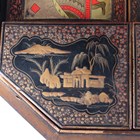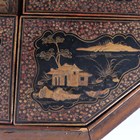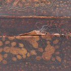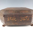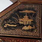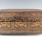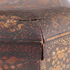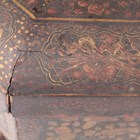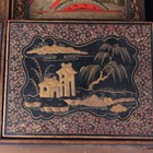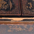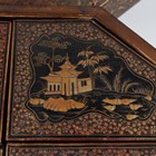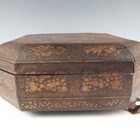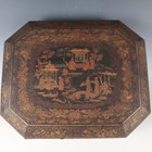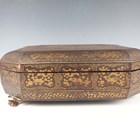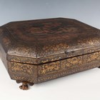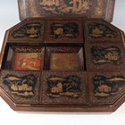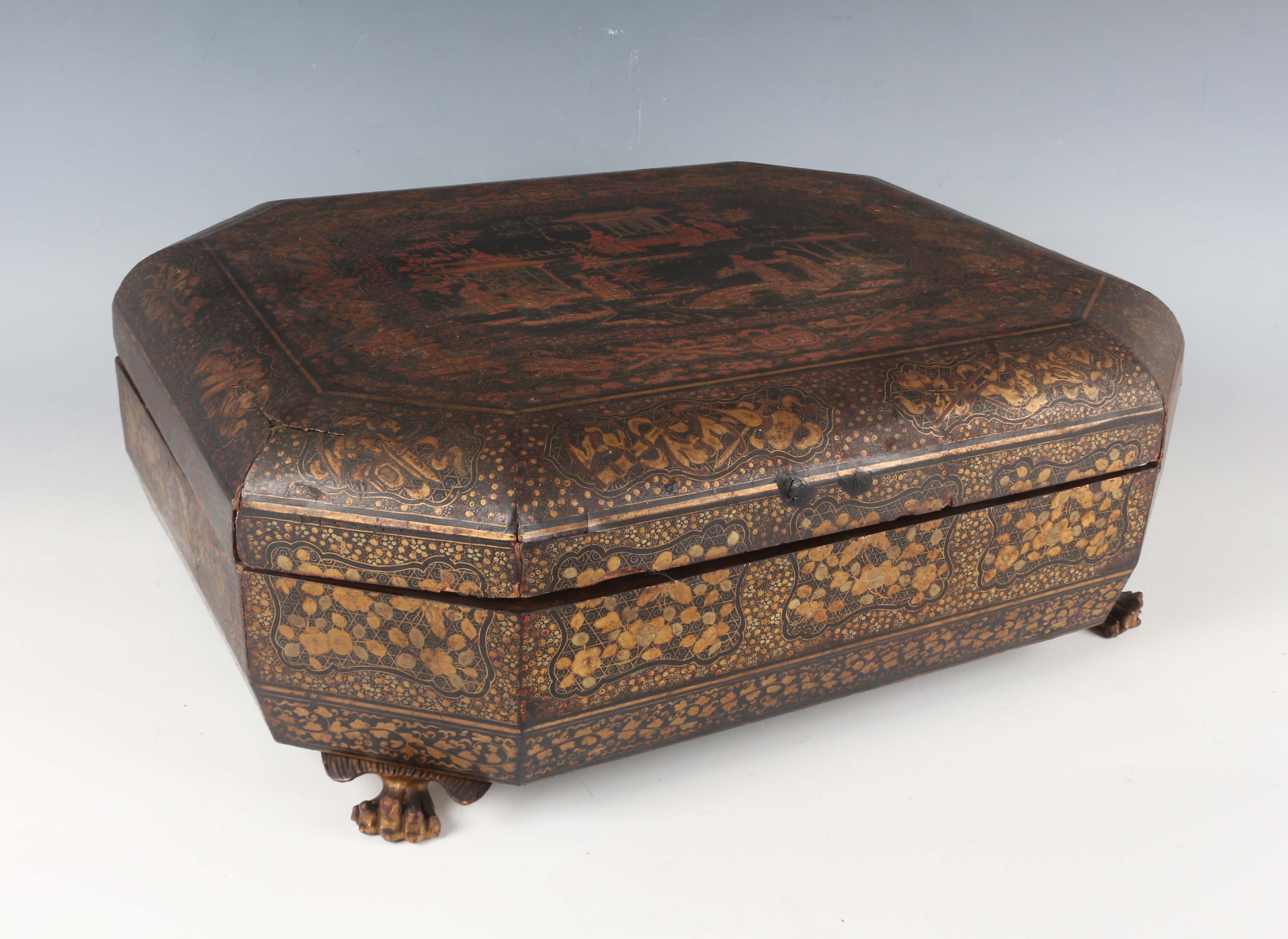 A Chinese Canton export lacquer games box, early to mid 19th century, of canted corner rectangular form, the removable cover and sides decorated in gilt with a village scene of figures and pavilions within borders of precious objects and flowers, the interior fitted with seven similarly decorated boxes and covers and six stacking counter trays, variously decorated with playing cards, figures and foliage, on carved giltwood paw feet, length 37.5cm (faults).