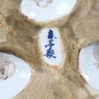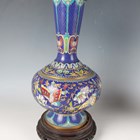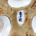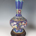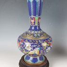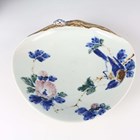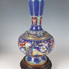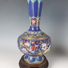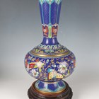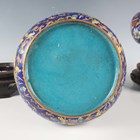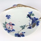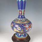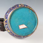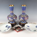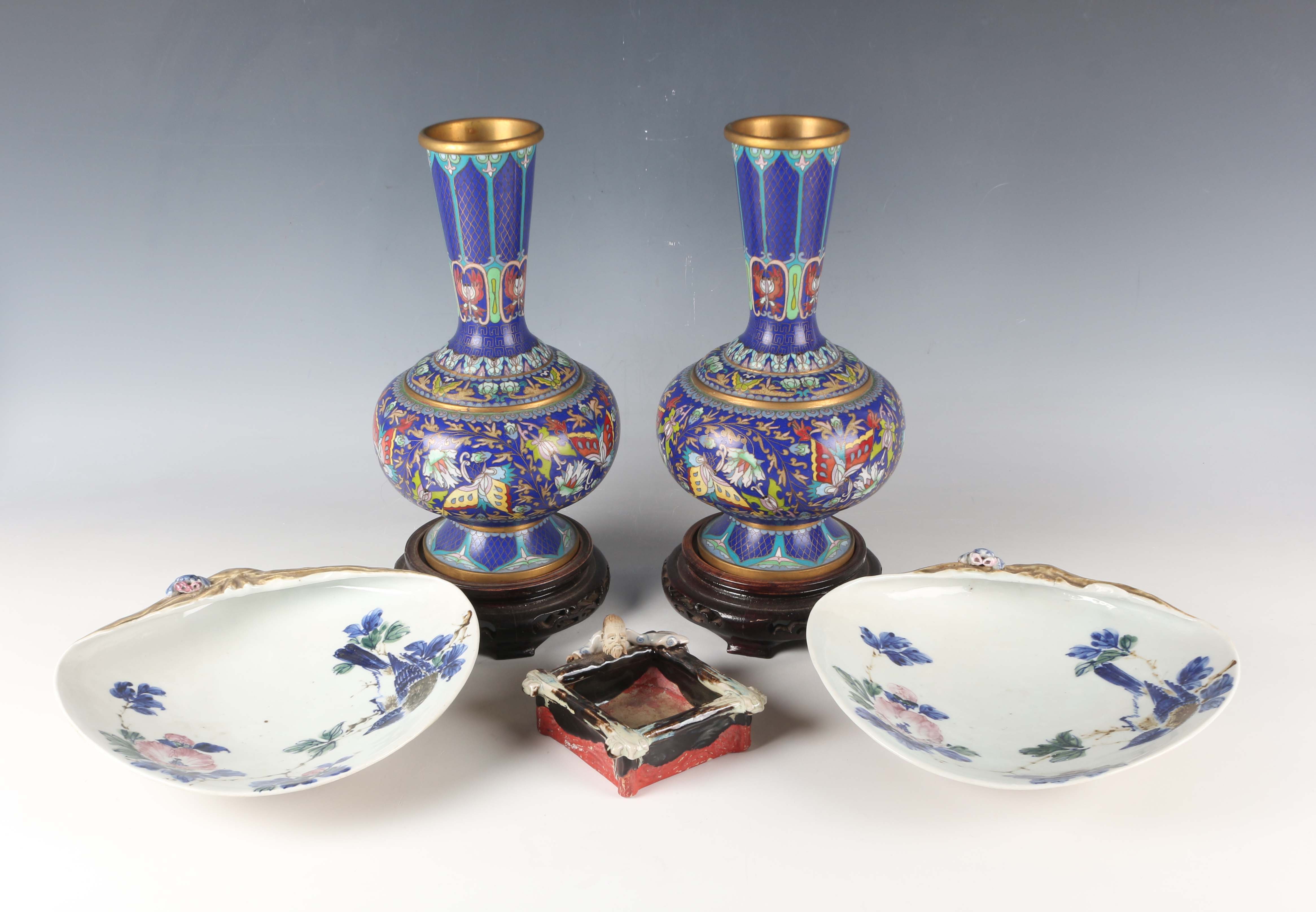 A pair of Chinese cloisonné bottle vases, late 20th century, each decorated with polychrome butterflies and foliage on a blue ground, height 26cm, with stands, together with a pair of Japanese porcelain shell dishes, each painted with a bird and flowers, width 23cm, and a Japanese Sumida ware brushwasher, width 13.3cm.