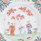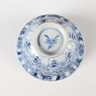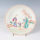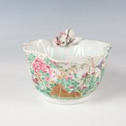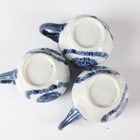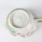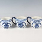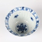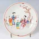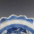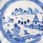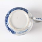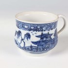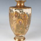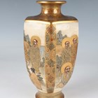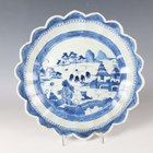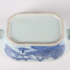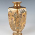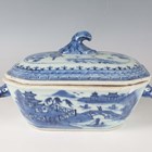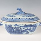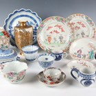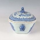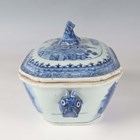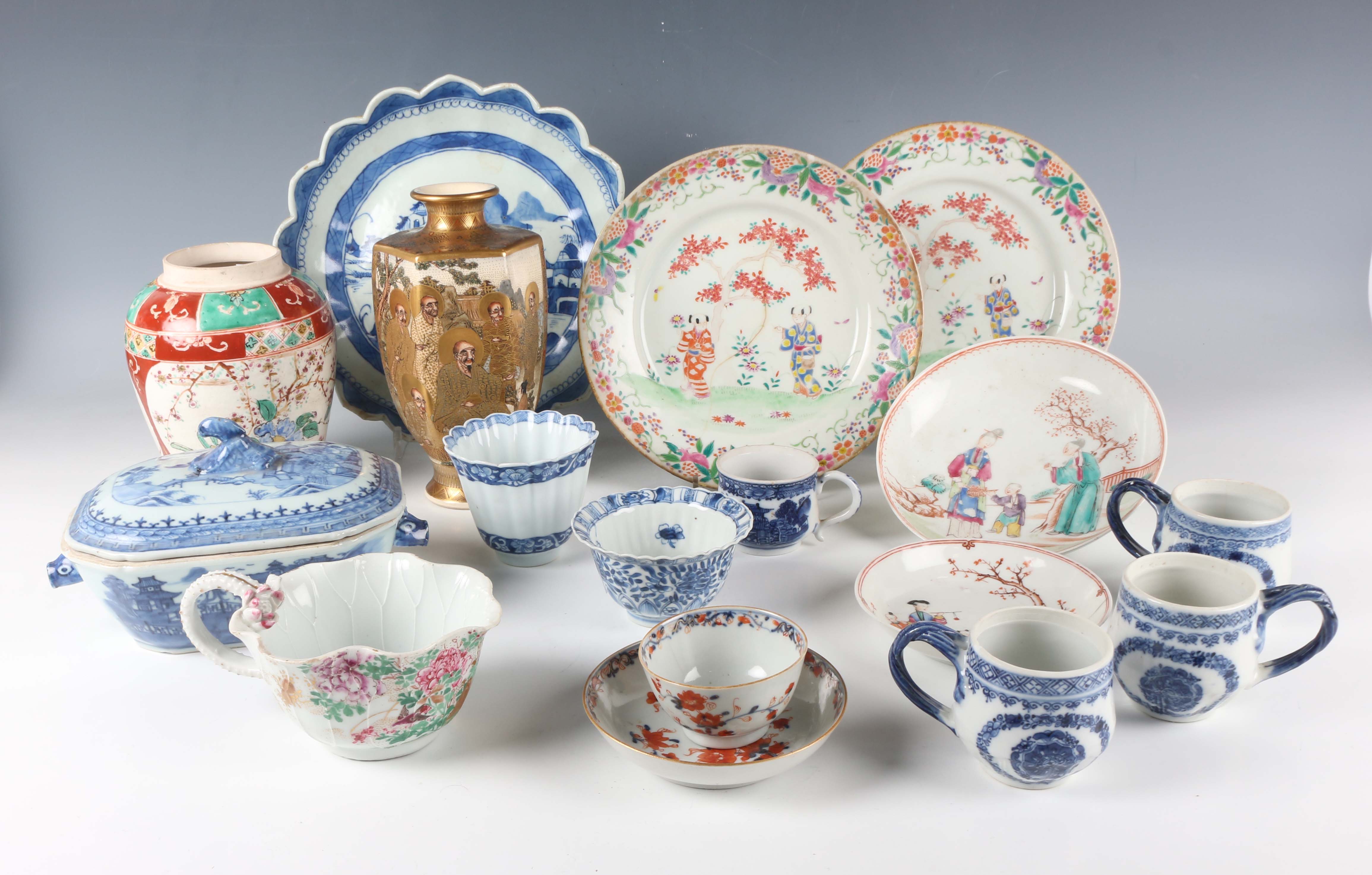 A collection of Chinese and Japanese pottery, 18th and 19th century, including a Japanese Satsuma hexagonal vase, Meiji period, painted and gilt with arhats, height 18cm, a Chinese blue and white export porcelain sauce tureen and cover, Qianlong period, length 18.5cm (chipped), a Canton blue and white circular dish, diameter 24cm, four Chinese blue and white custard cups (lacking covers), and a Japanese lotus form sauceboat (some faults).