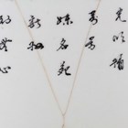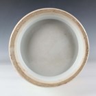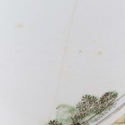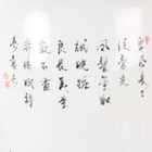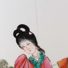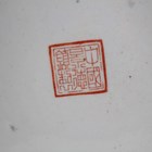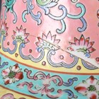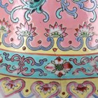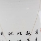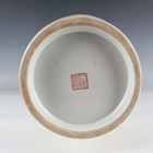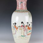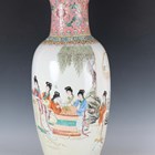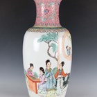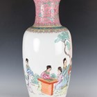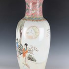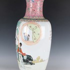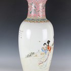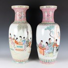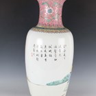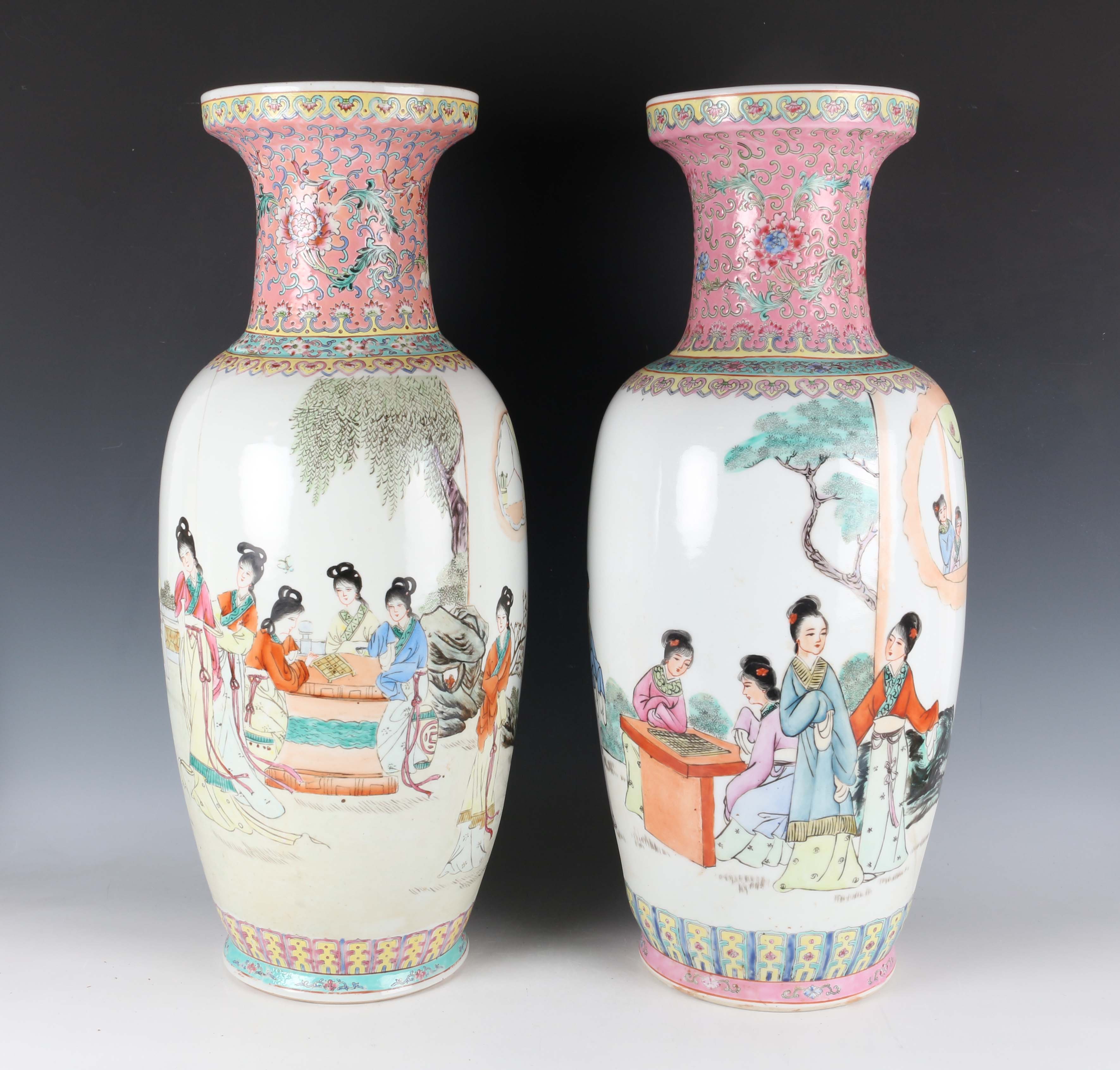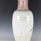 A pair of Chinese famille rose porcelain vases, mid-20th century, each shouldered tapering body painted with a figural scene opposing lines of black text and red seals, beneath a flared neck decorated with polychrome flowers and scrolling tendrils on a pink ground, red printed seal mark to bases, height 61cm (one repaired).