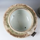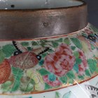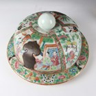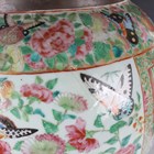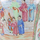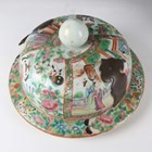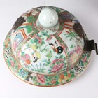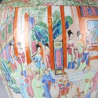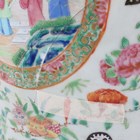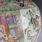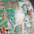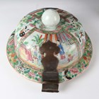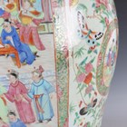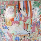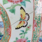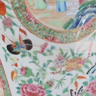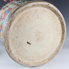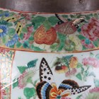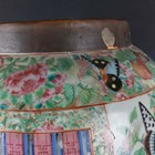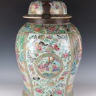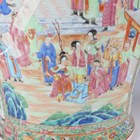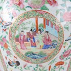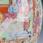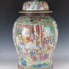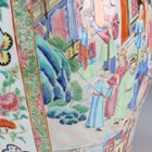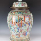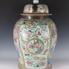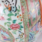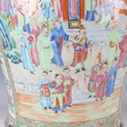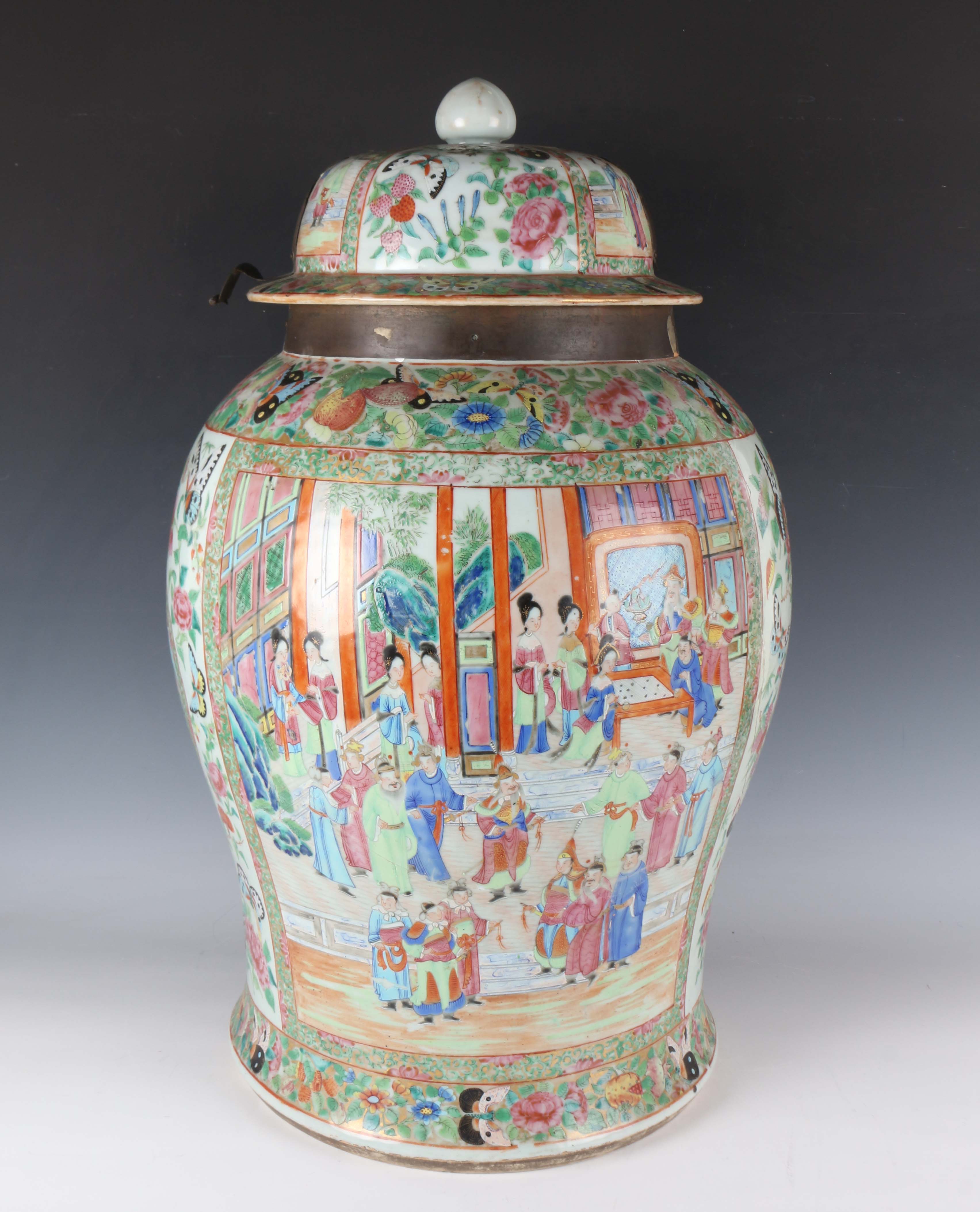 A large Chinese Canton famille rose porcelain jar and domed cover, mid-19th century, the baluster body typically painted with figural panels within borders of birds, flowers, fruit and butterflies, height 62cm (extensively restored and damaged).