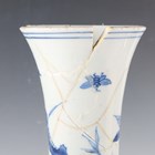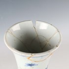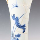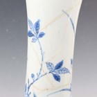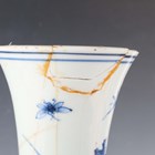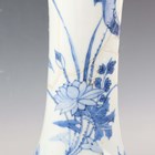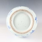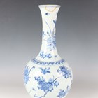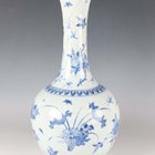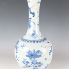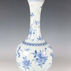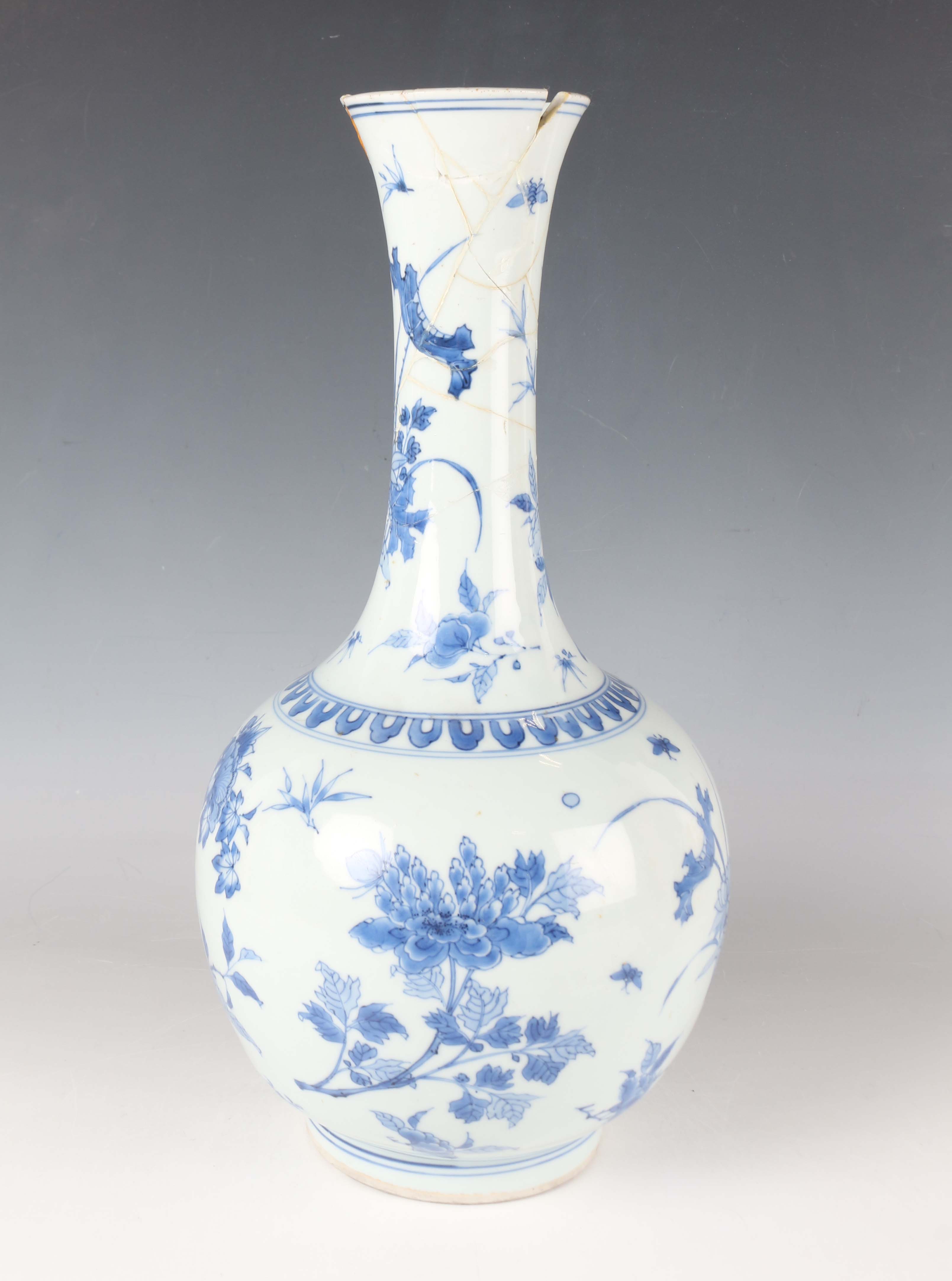 A Chinese blue and white porcelain bottle vase, Transitional/Kangxi period, the globular body and flared narrow neck painted with sprays of lotus, peony and other flowers within double line borders, unmarked, height 37cm (neck extensively repaired and some losses).