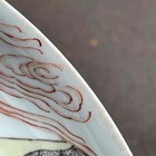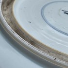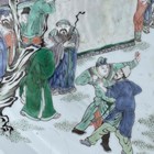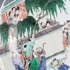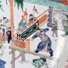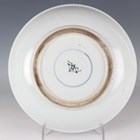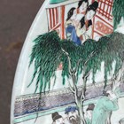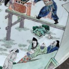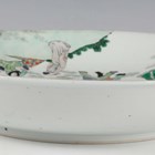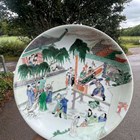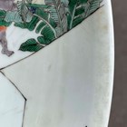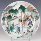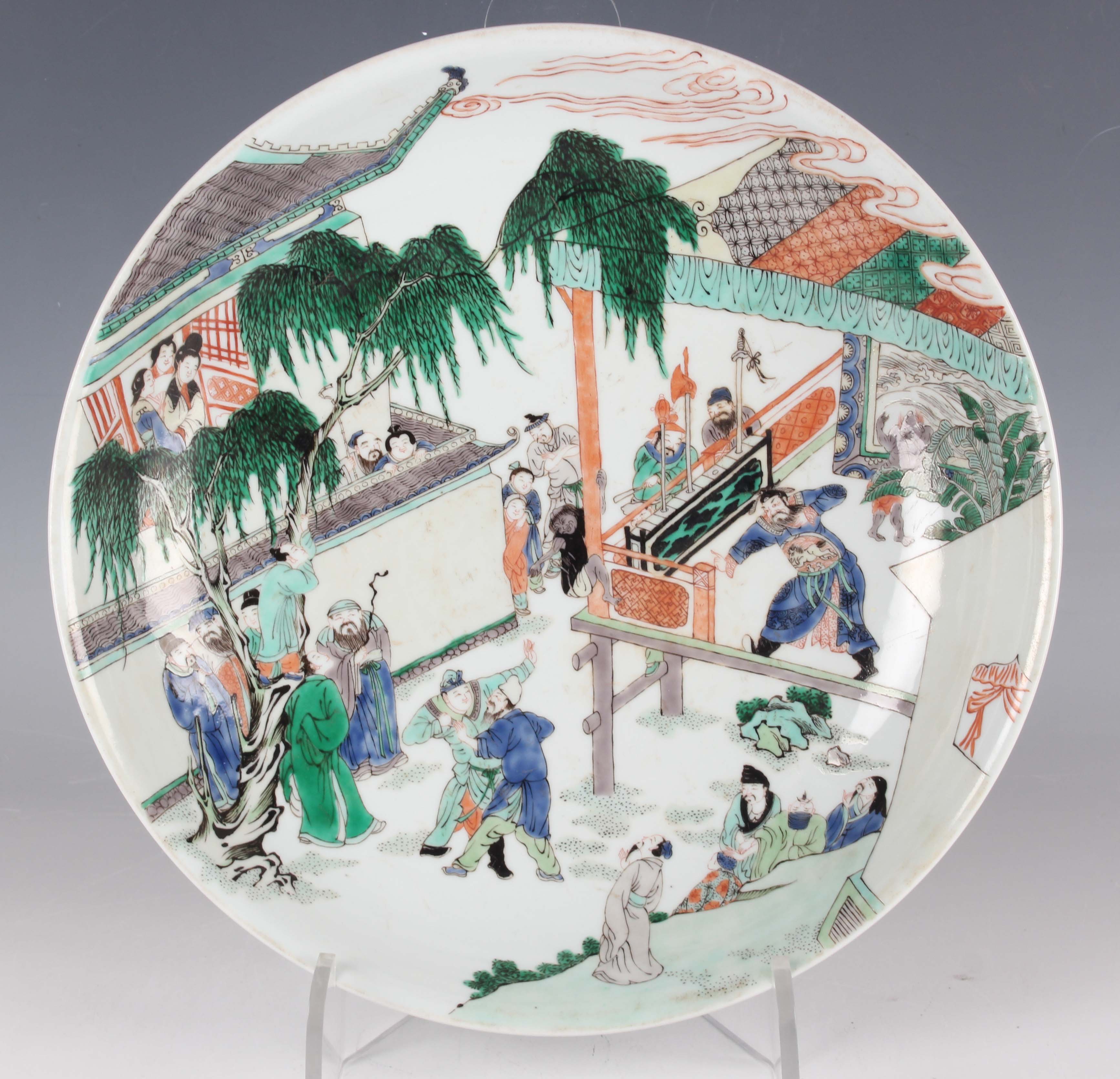 A Chinese famille verte porcelain circular dish, Kangxi style but probably late 19th century, painted with a figural scene and pavilions, underglaze blue swastika in lozenge and double ring to base, diameter 28.6cm.