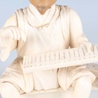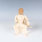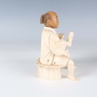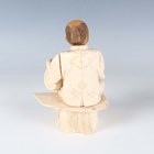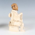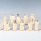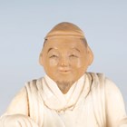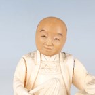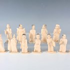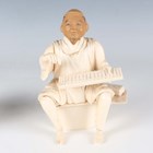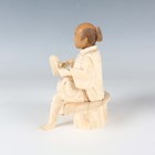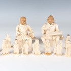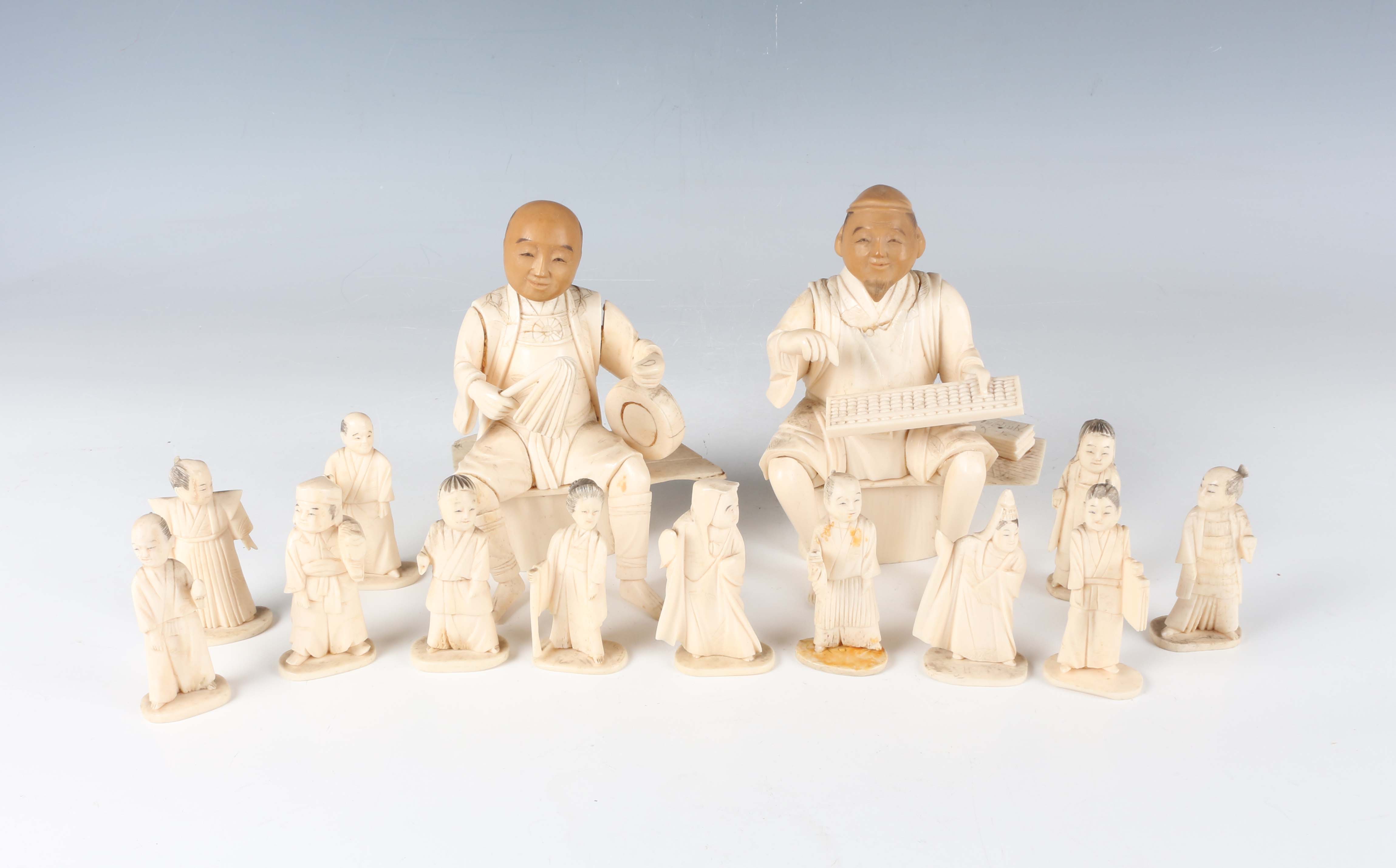 A pair of Japanese carved bone and vegetable ivory sectional figures, Meiji period, one modelled as a seated musician, the other as a seated street vendor, heights 12.3cm and 12.5cm, together with a group of twelve smaller Japanese carved bone figures, heights approx 6cm.