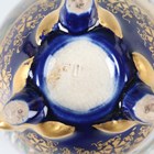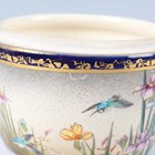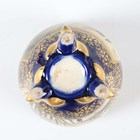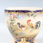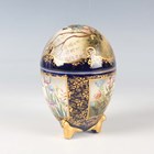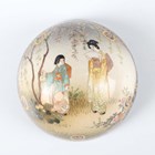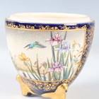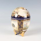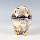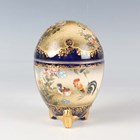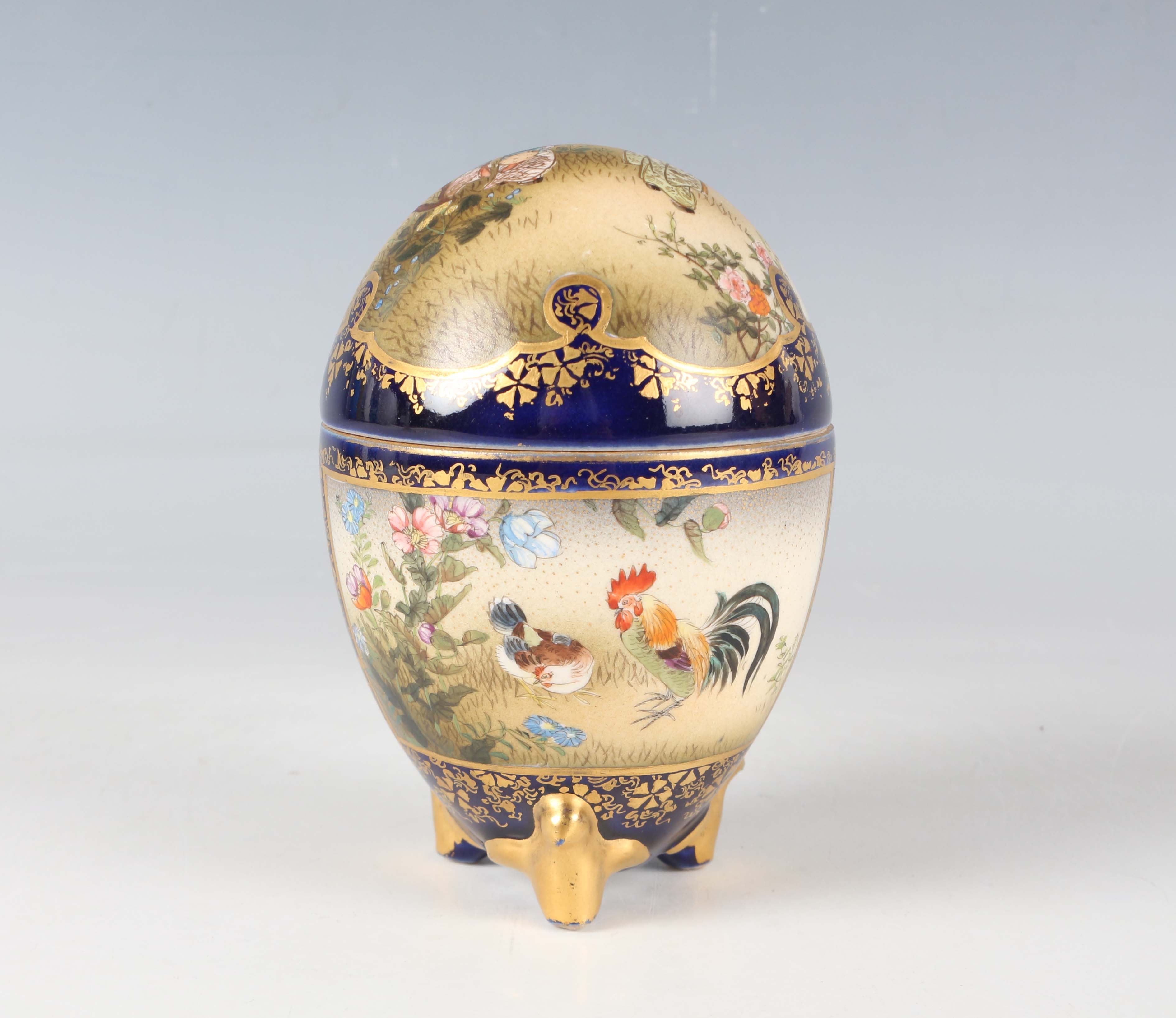 A Japanese Satsuma earthenware egg shaped jar and cover by Kinkozan, Meiji period, painted and gilt with panels of figures beneath wisteria, cockerel, hen and flowers and kingfisher above iris, within blue and gilt borders, gilt and impressed signatures to base, height 10.3cm.