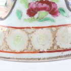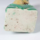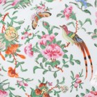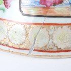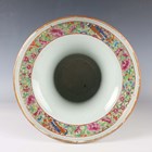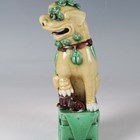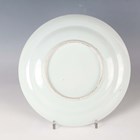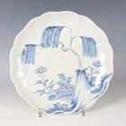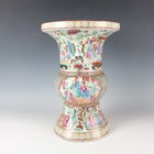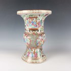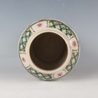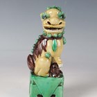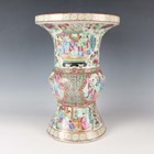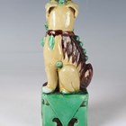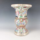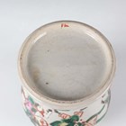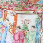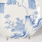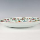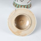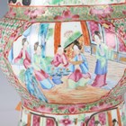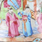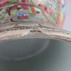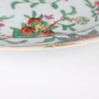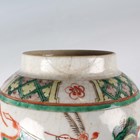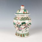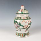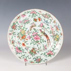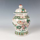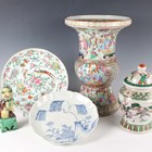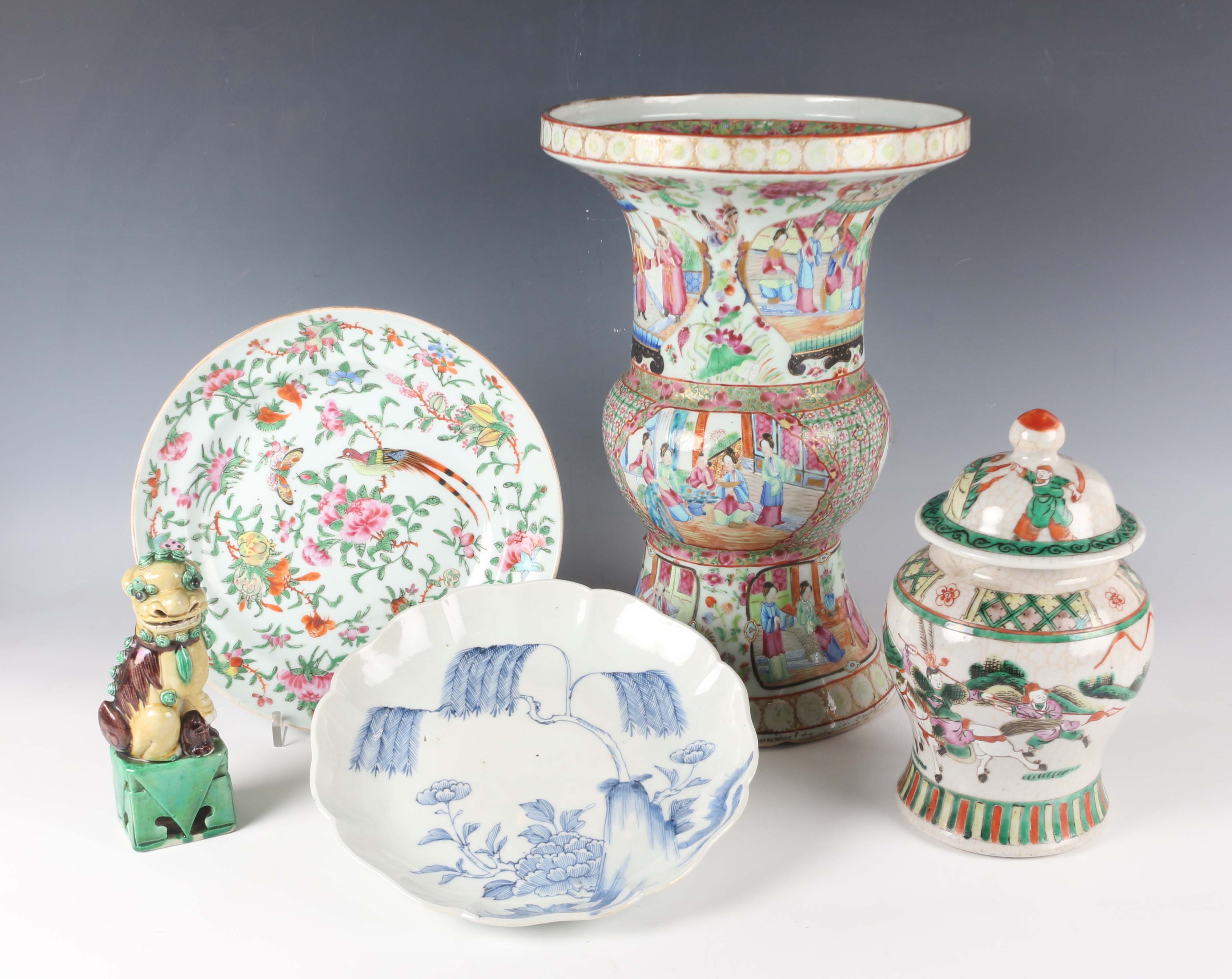 A Chinese Canton famille rose porcelain vase, mid-19th century, the squat body with flared neck and foot, typically painted with figural panels, height 33.2cm (repaired), a Japanese Arita blue and white porcelain dish, Meiji period, painted with pine and peony, diameter 22cm, a Canton famille rose plate, painted with birds, fruit and flowers, diameter 24cm, a Chinese famille verte crackle glazed porcelain jar and cover (repaired), height 21.5cm, and a famille verte enamelled porcelain Buddhistic lion on a pierced cube base, height 15,5cm.