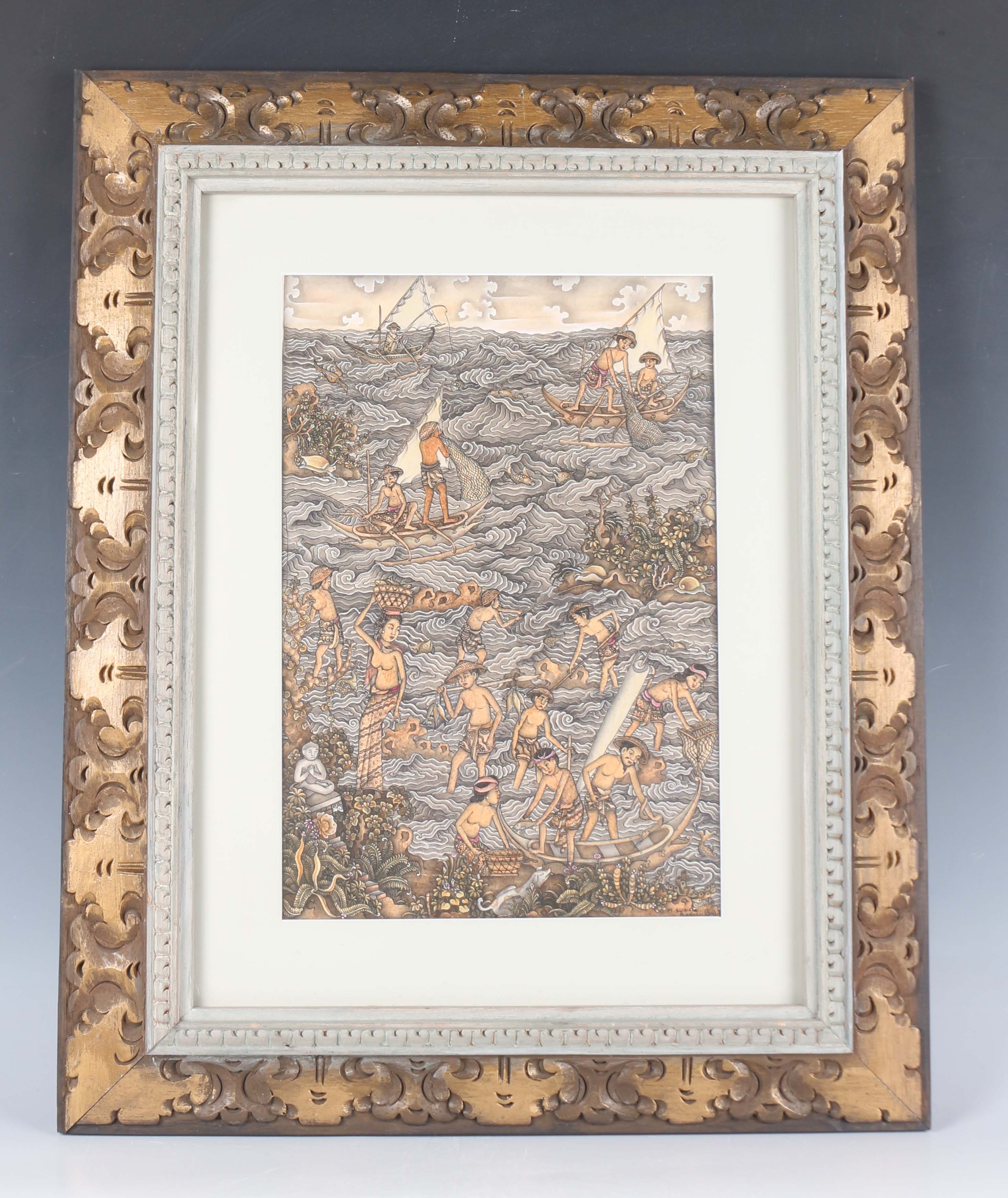 M. Suwej - a Balinese Batuan watercolour on paper, 20th century, depicting a fishing scene with figures hauling in nets and carrying the catch, signed 'M. Suwej Batuan Bali' to lower right corner, 31cm x 21cm, framed and glazed.