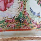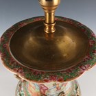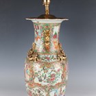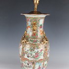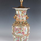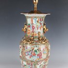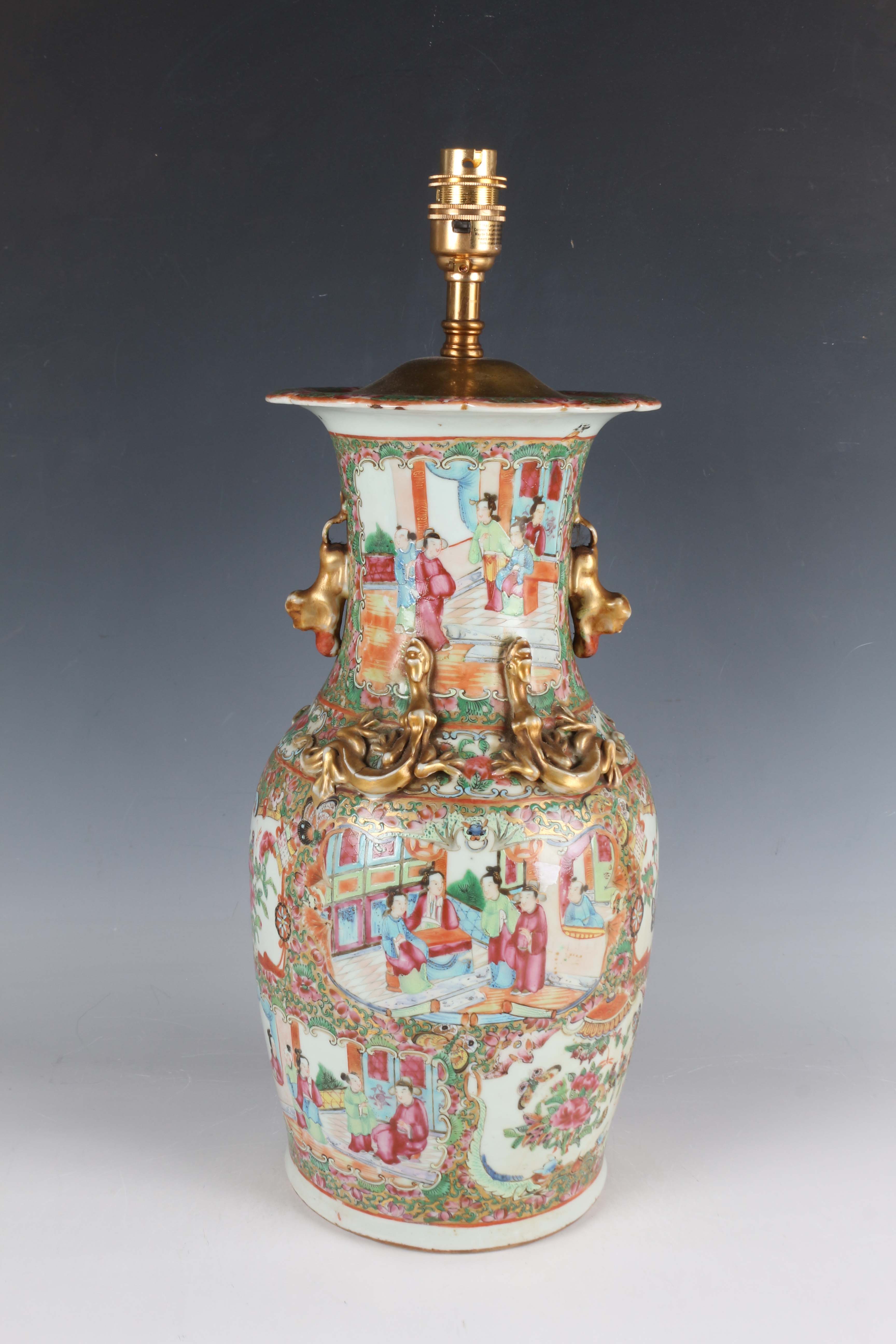 A Chinese Canton famille rose porcelain vase, mid to late 19th century, the shouldered tapering body and flared neck typically painted with figures, flowers, butterflies and birds, applied gilt Buddhistic lion handles and two pairs of chilong to shoulders, height 36cm (drilled hole near to base and converted to a table lamp).
