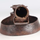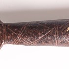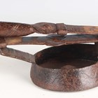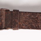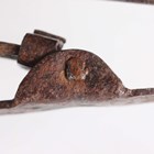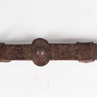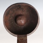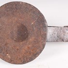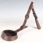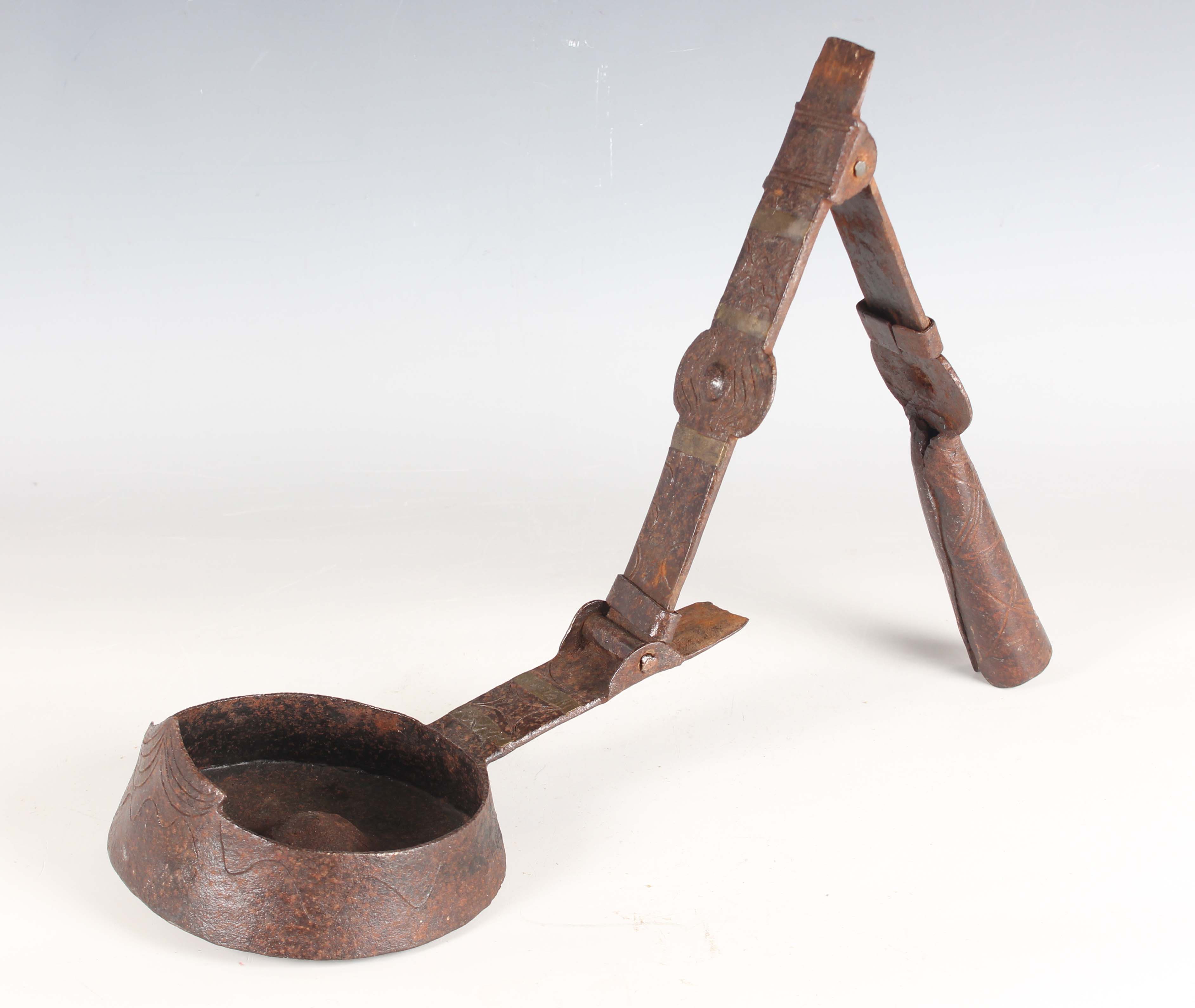 A Turkish Ottoman Empire wrought iron folding coffee bean roaster, 18th/19th century, the folding handle with brass mounts and engraved decoration, the circular pan with further engraved detail, total length 54.8cm.