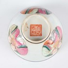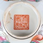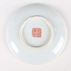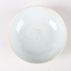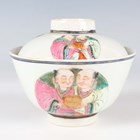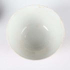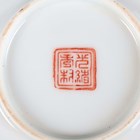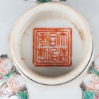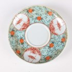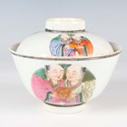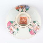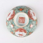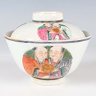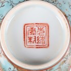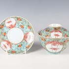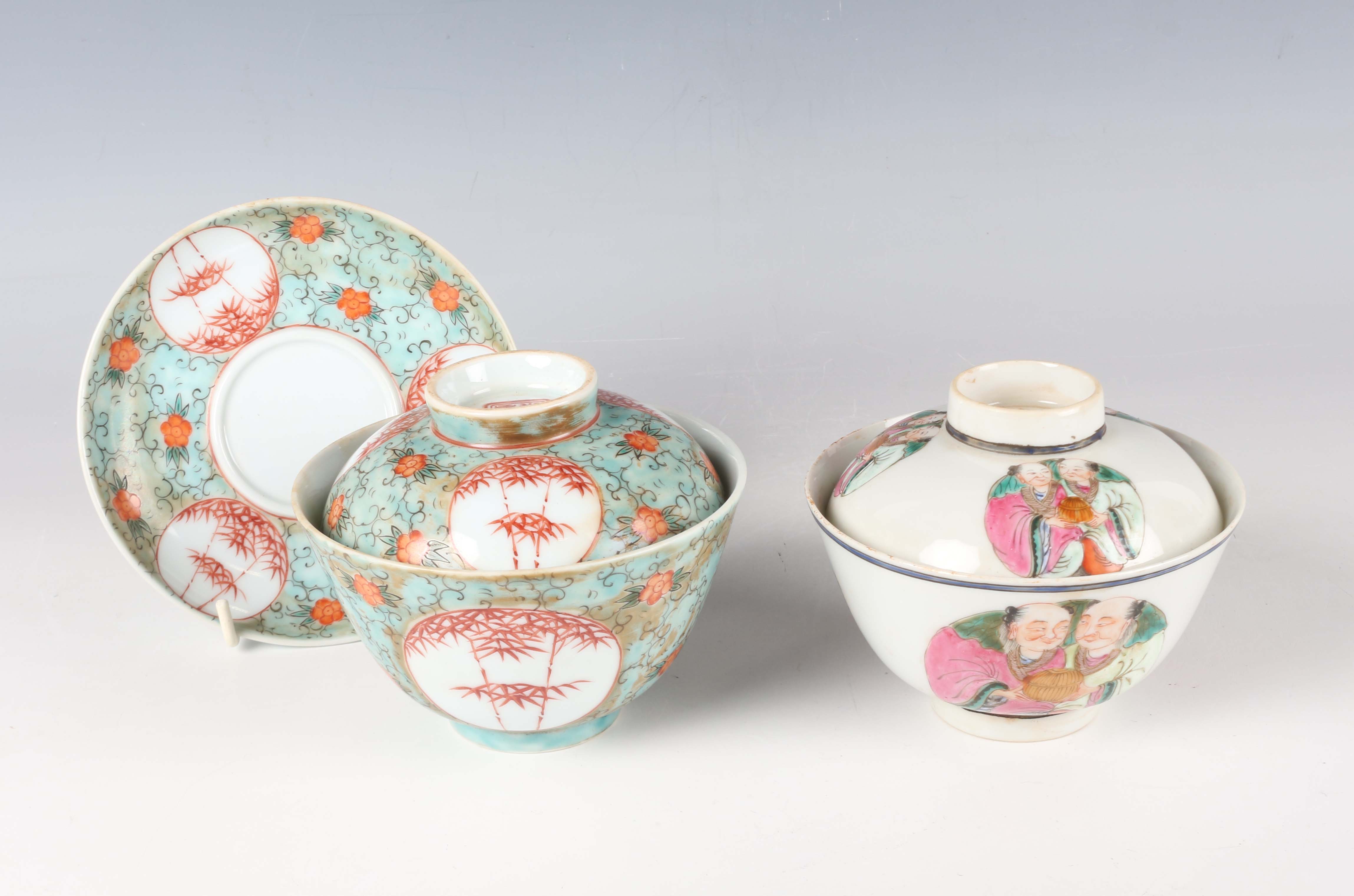 A Chinese famille rose teabowl and cover, mark of Tongzhi but probably 20th century, painted with figural roundels, iron red seal marks, height 8cm, together with a Chinese porcelain teabowl, cover and stand, painted with iron red bamboo roundels against a pale blue/turquoise ground filled with flowers and scrolling stems, red printed seal marks, total height 9.5cm.