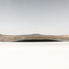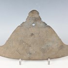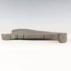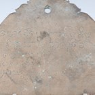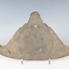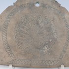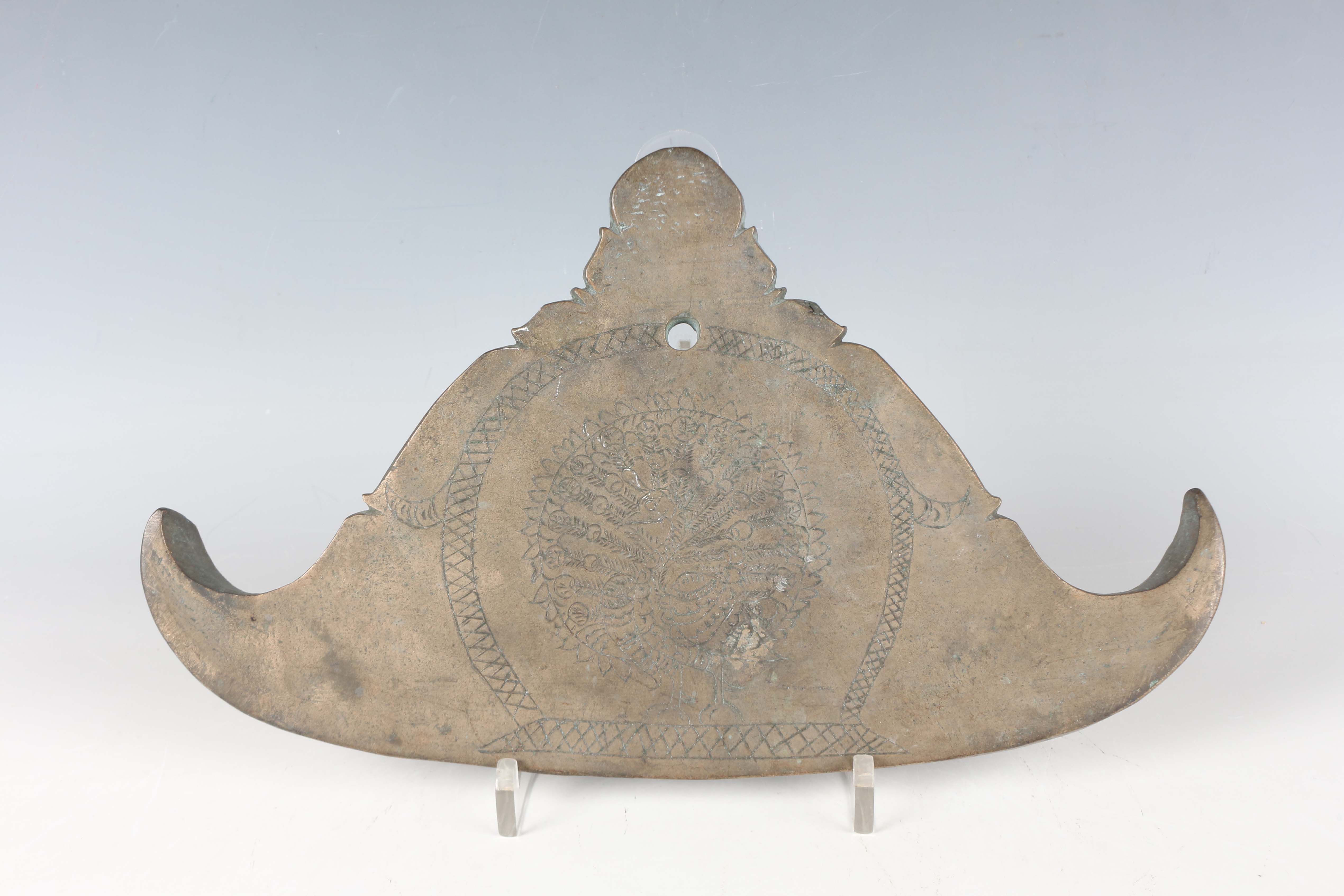 A Burmese bronze kyeezee (spinning gong), late 19th/early 20th century, of seated Buddha outline, one side engraved with a peacock, the reverse with lines of script, length 28cm.