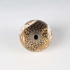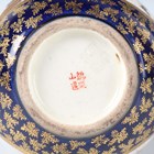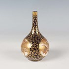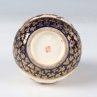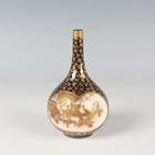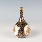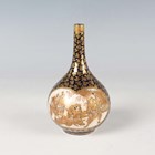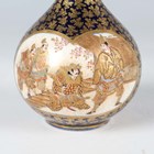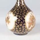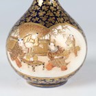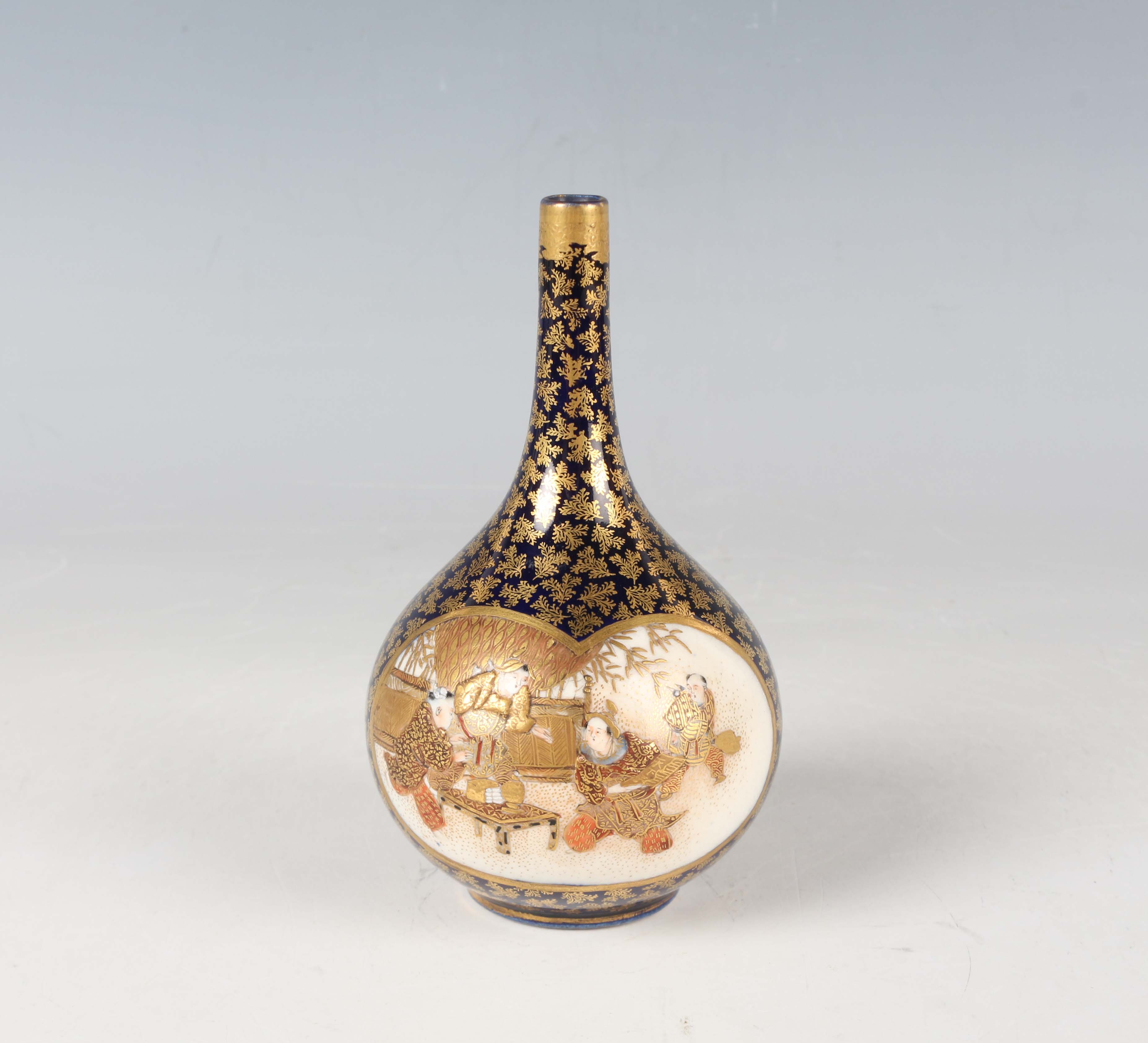 A Japanese Satsuma earthenware diminutive bottle vase by Kinkozan, Meiji period, the globular body with slender tapered neck, finely painted and gilt with opposing panels of samurai, reserved against a dark blue ground filled with gilt leaves, iron red painted signature and impressed seal mark to base, height 9.4cm.