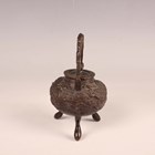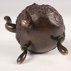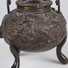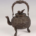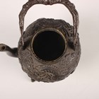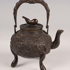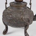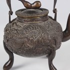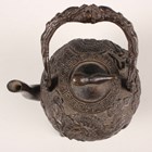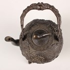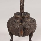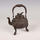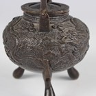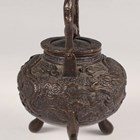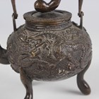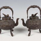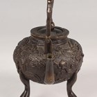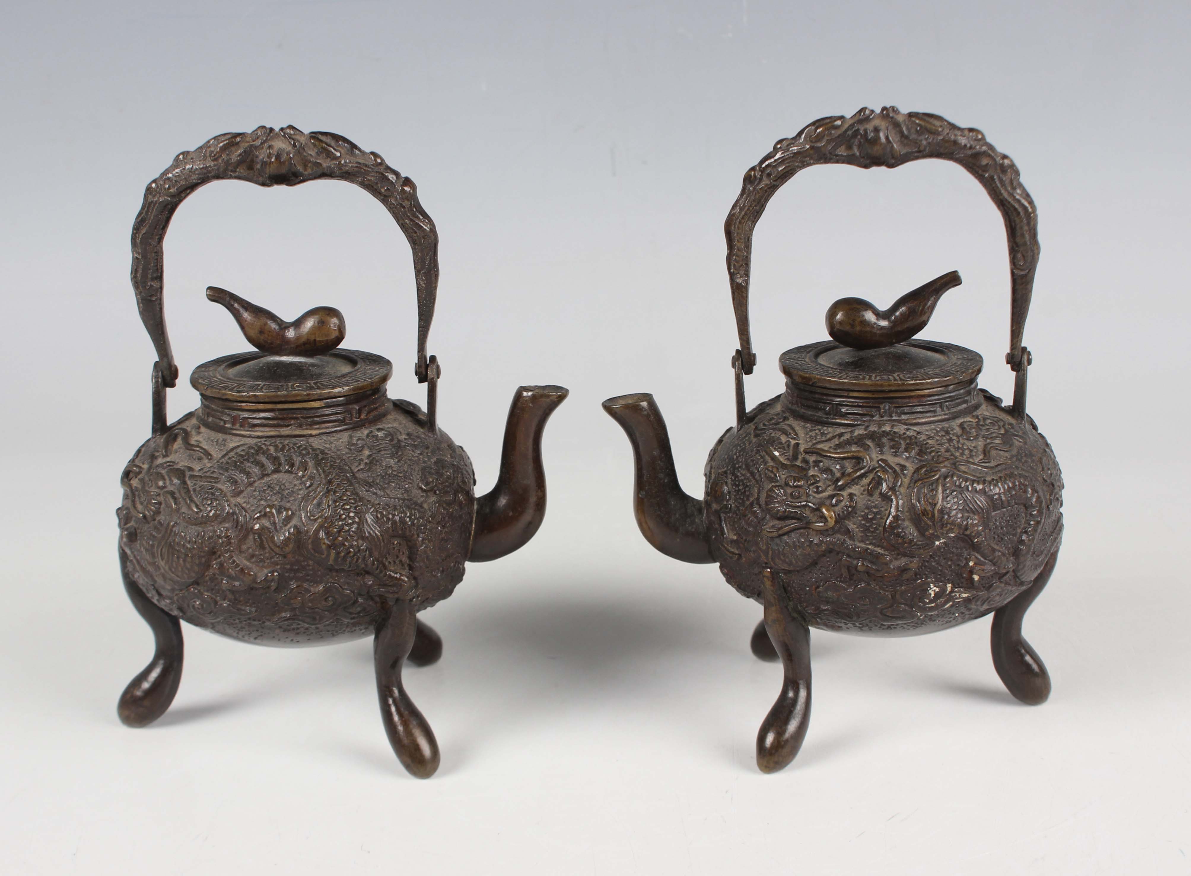 A pair of Chinese brown patinated bronze diminutive kettles, late Qing dynasty, each globular body cast with dragons, below a cast dragon swing handle and gourd bottle finial to cover, on scroll feet, heights 11.2cm.
