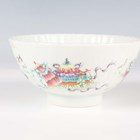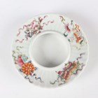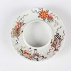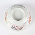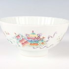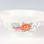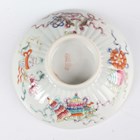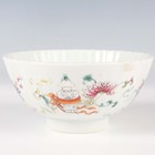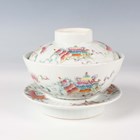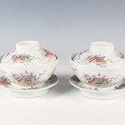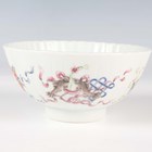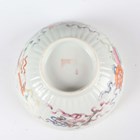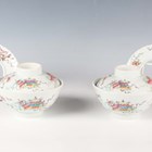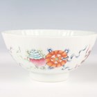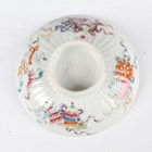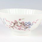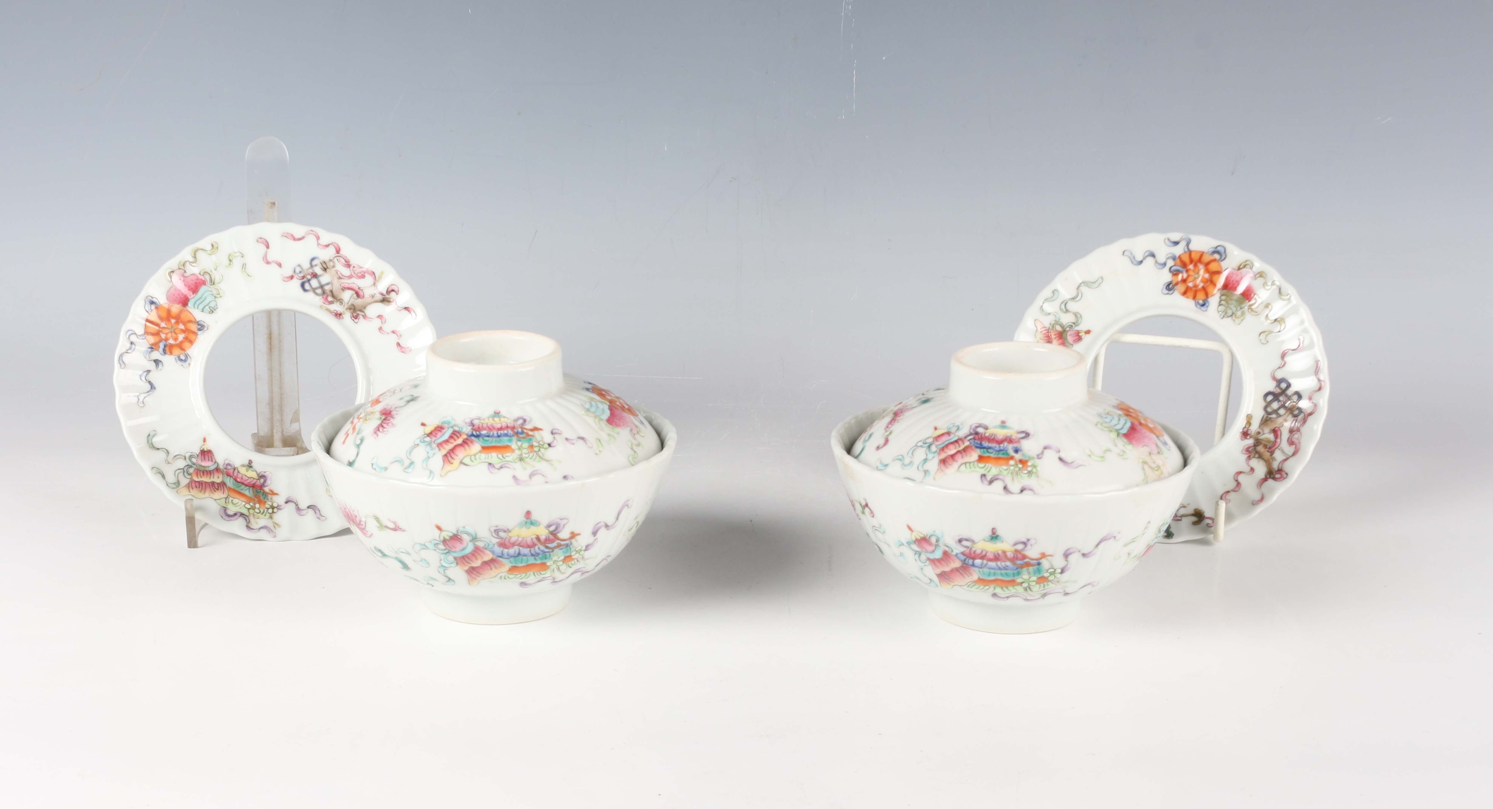 A pair of Chinese famille rose porcelain teabowls, covers and stands, mark of Tongzhi but probably later, each piece of fluted circular form and enamelled with the eight Buddhistic emblems, height 8.6cm.