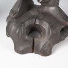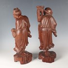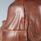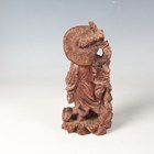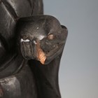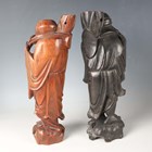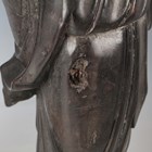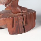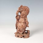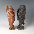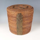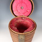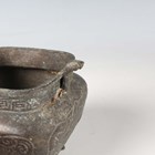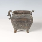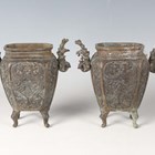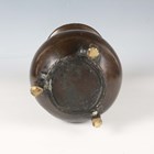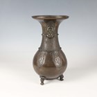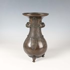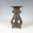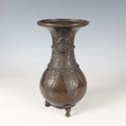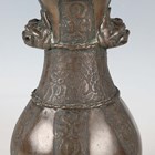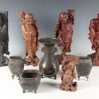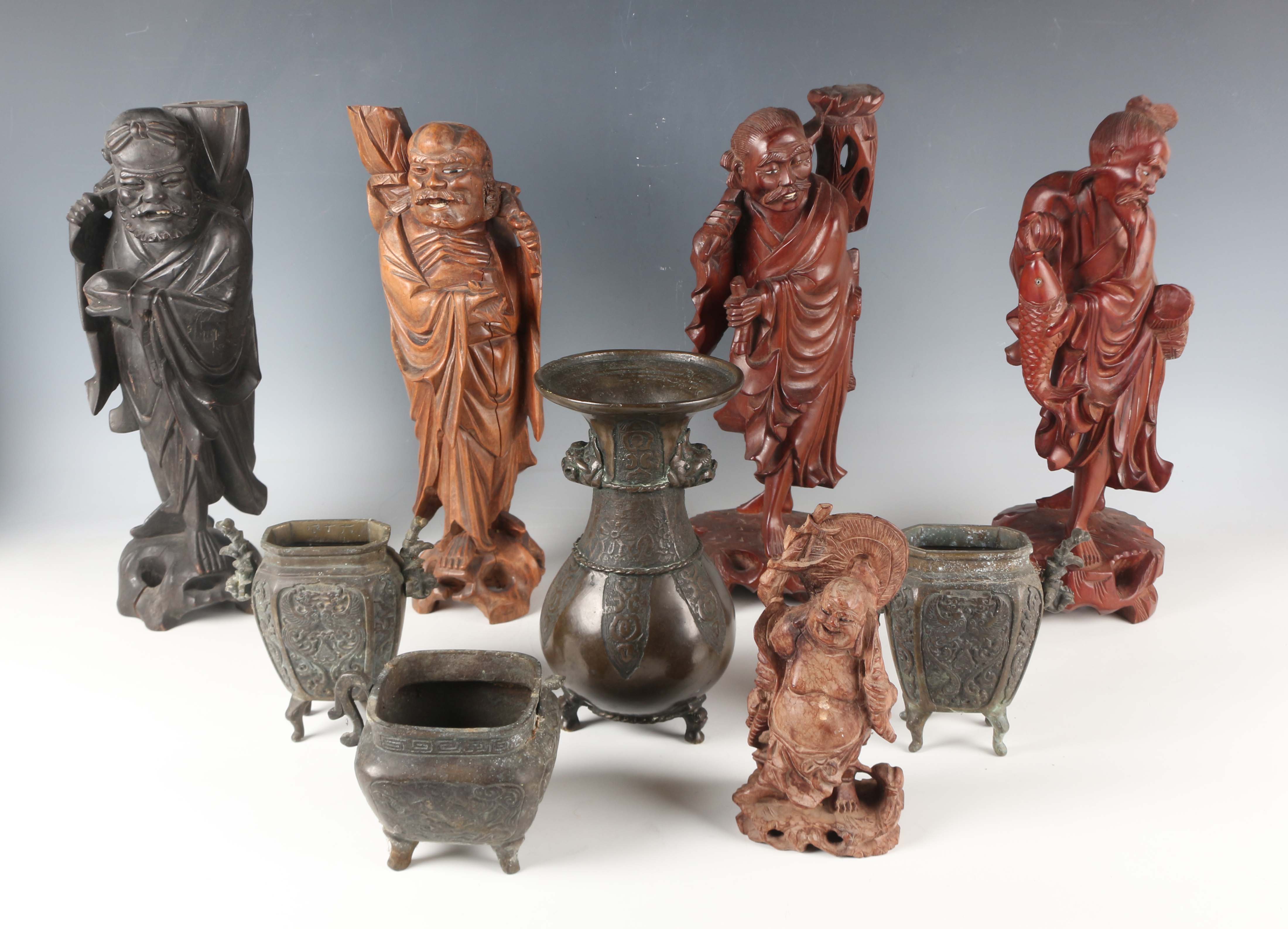 A Chinese brown patinated archaistic bronze vase, 19th century, cast with lion mask handles and lappet panels, height 19cm, together with a Chinese wicker cylindrical teapot case, five carved wood figures and three bronze vessels.