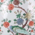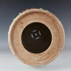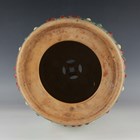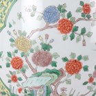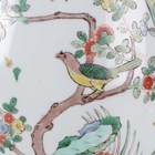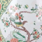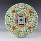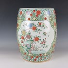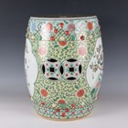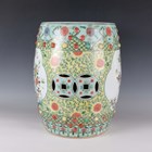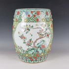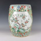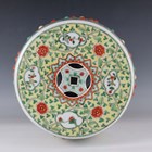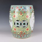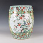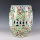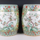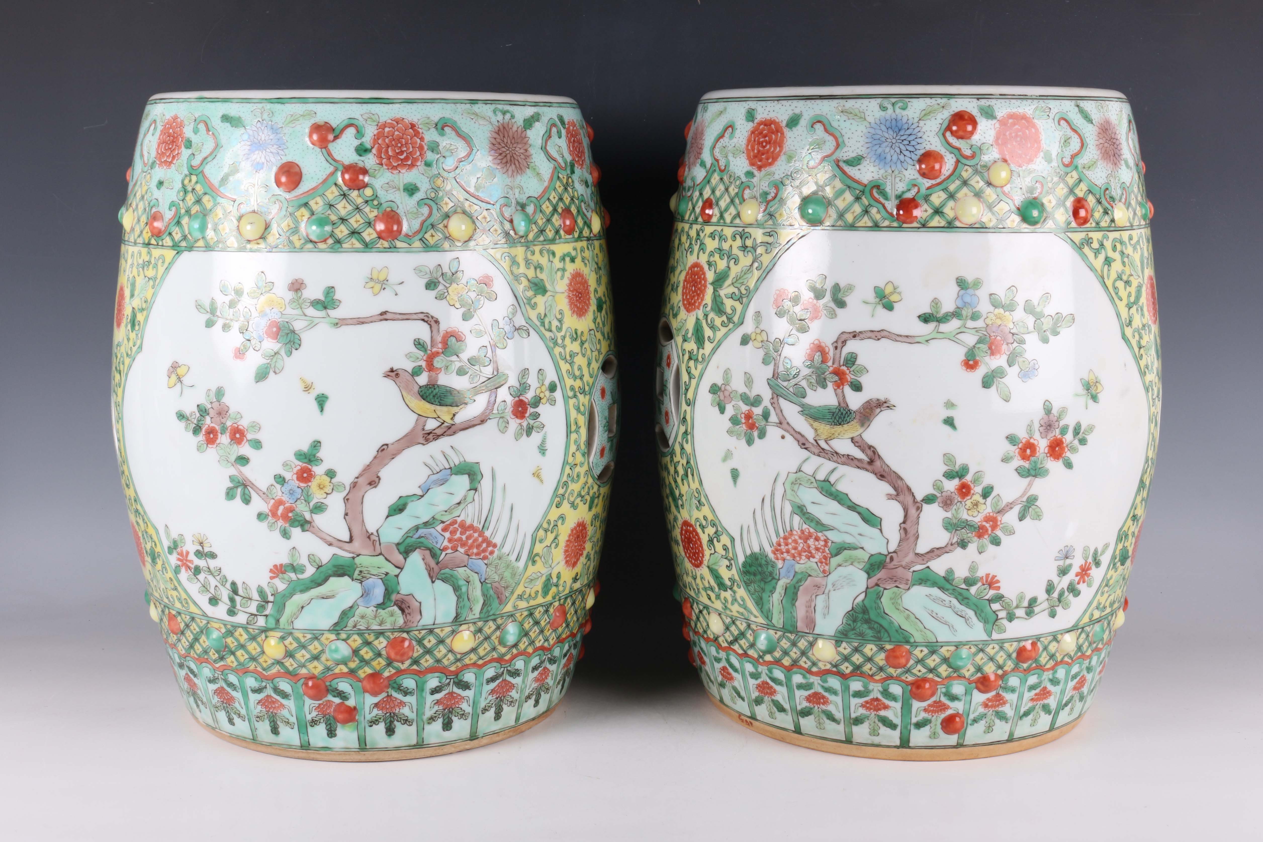 A pair of Chinese famille verte yellow ground porcelain garden seats, early to mid-20th century, of barrel form with relief moulded simulated stud decoration and pierced cash motifs, painted with panels of birds, butterflies and flowering branches, reserved against a yellow ground filled with iron red flowerheads and green scrolling tendrils, height 37cm.